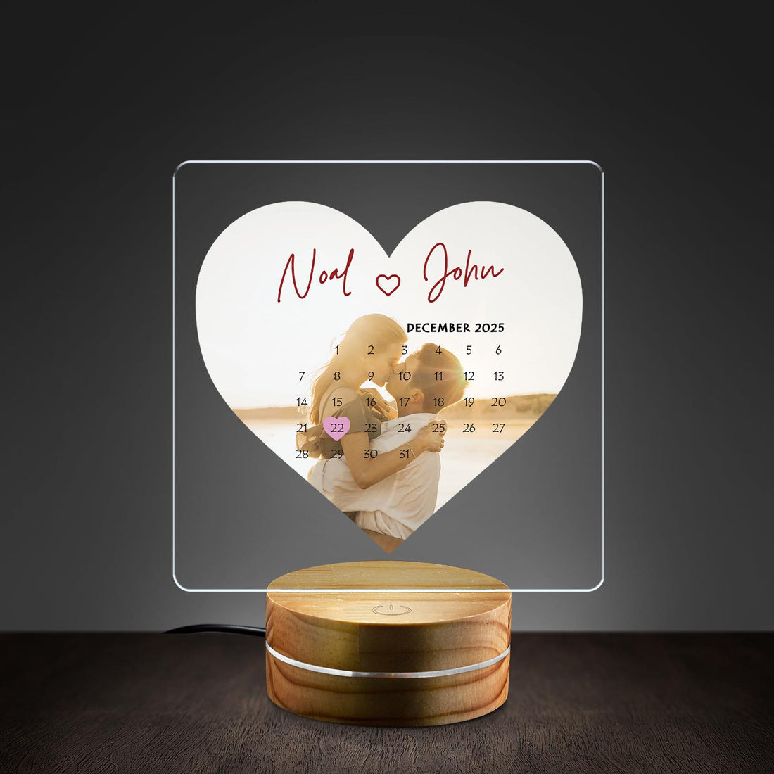 Personalized Save the Date Night Light - Custom Heart Photo Calendar Acrylic Lamp - Romantic Wedding & Anniversary Keepsake