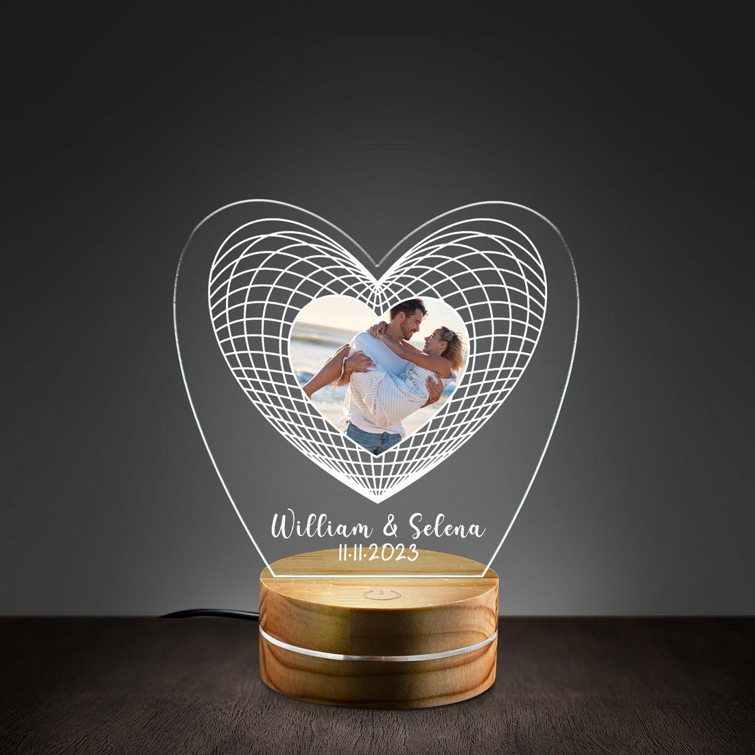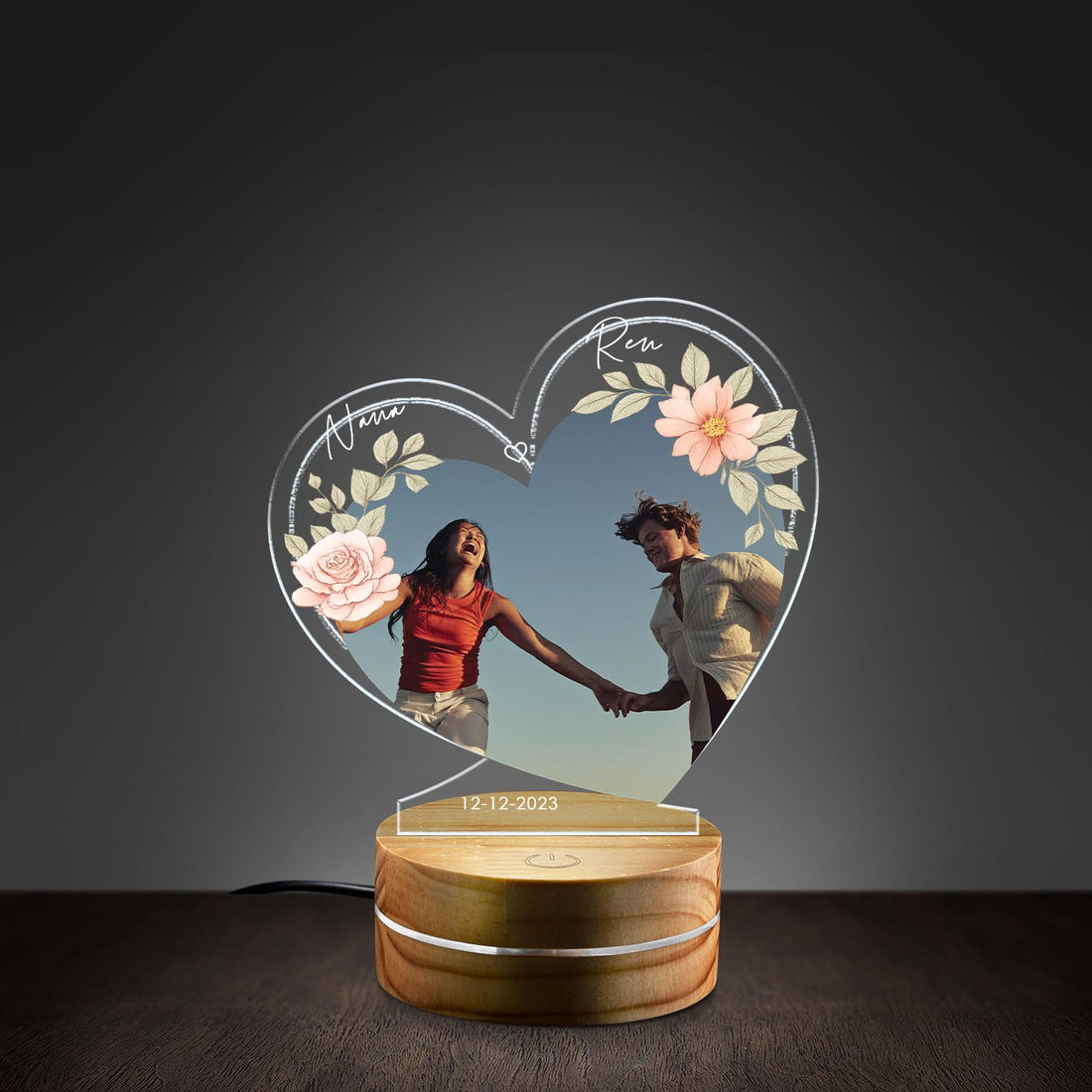 Custom Couple Heart Acrylic Light with Round Wooden Base - Personalized Romantic Keepsake with Photo, Names, and Special Date