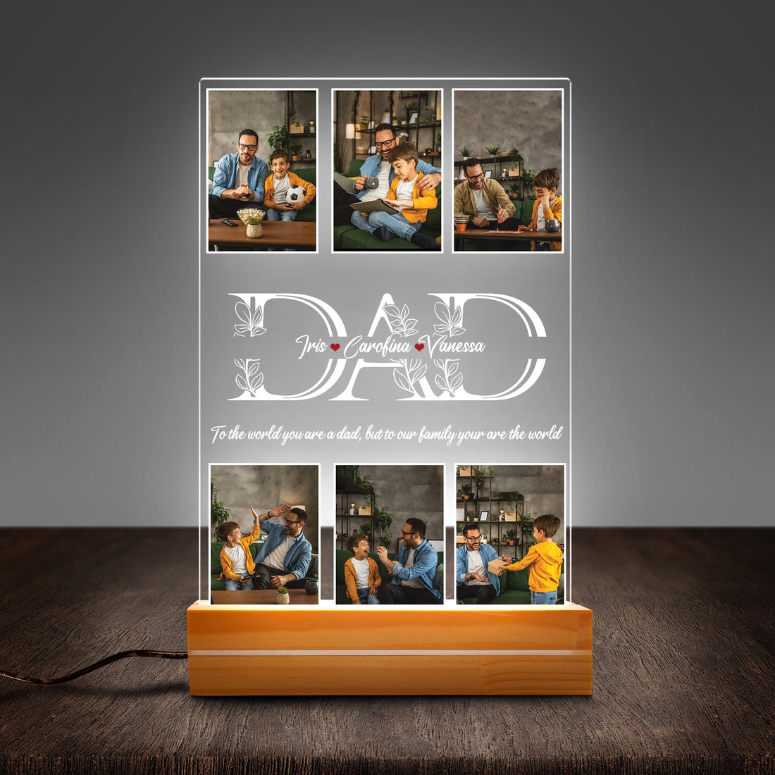 Personalized "DAD" Photo Night Light with Wooden Rectangle Base – Custom 6-Photo Collage Lamp, Father’s Day Gift