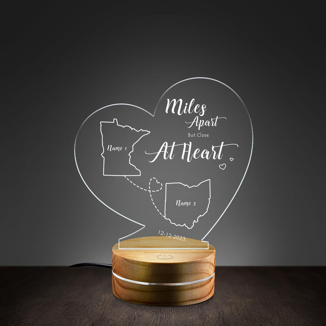 Custom "Miles Apart But Close At Heart" LED Light - Personalized State Map & Name Acrylic Lamp, Decor for Couples & Friends