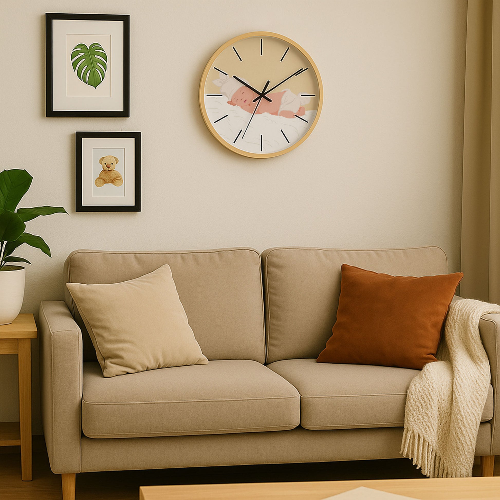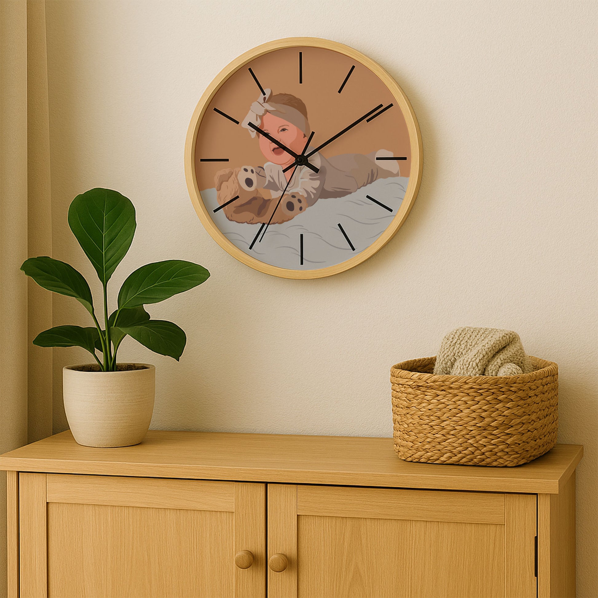 "I wanted to create a keepsake that held the profound stillness of our newborn’s first days, a moment for our family to return to even as time rushed forward. I chose a personalized illustration, where every delicate feature was etched with tenderness, and placed it on a clock. Now, it hangs in our home, its hands forever circling that peaceful face. It’s our gentle anchor—a visual sigh in the busy rhythm of our days, reminding us that beneath all the noise and growth, the pure, quiet love that arrived with you remains the heart of our family, timeless and true."