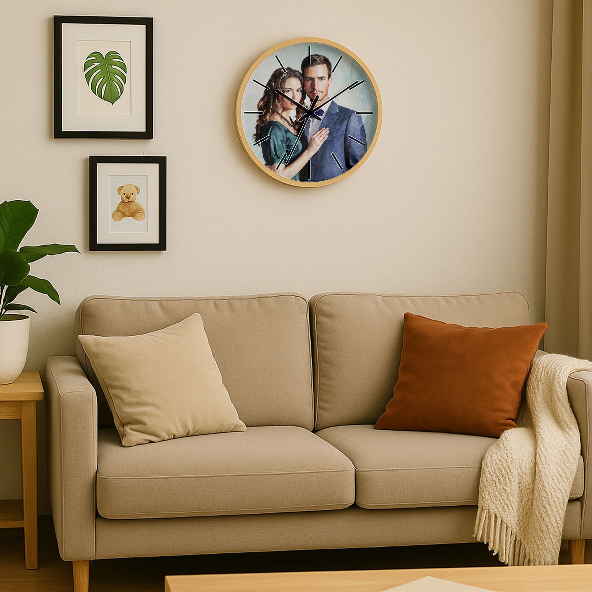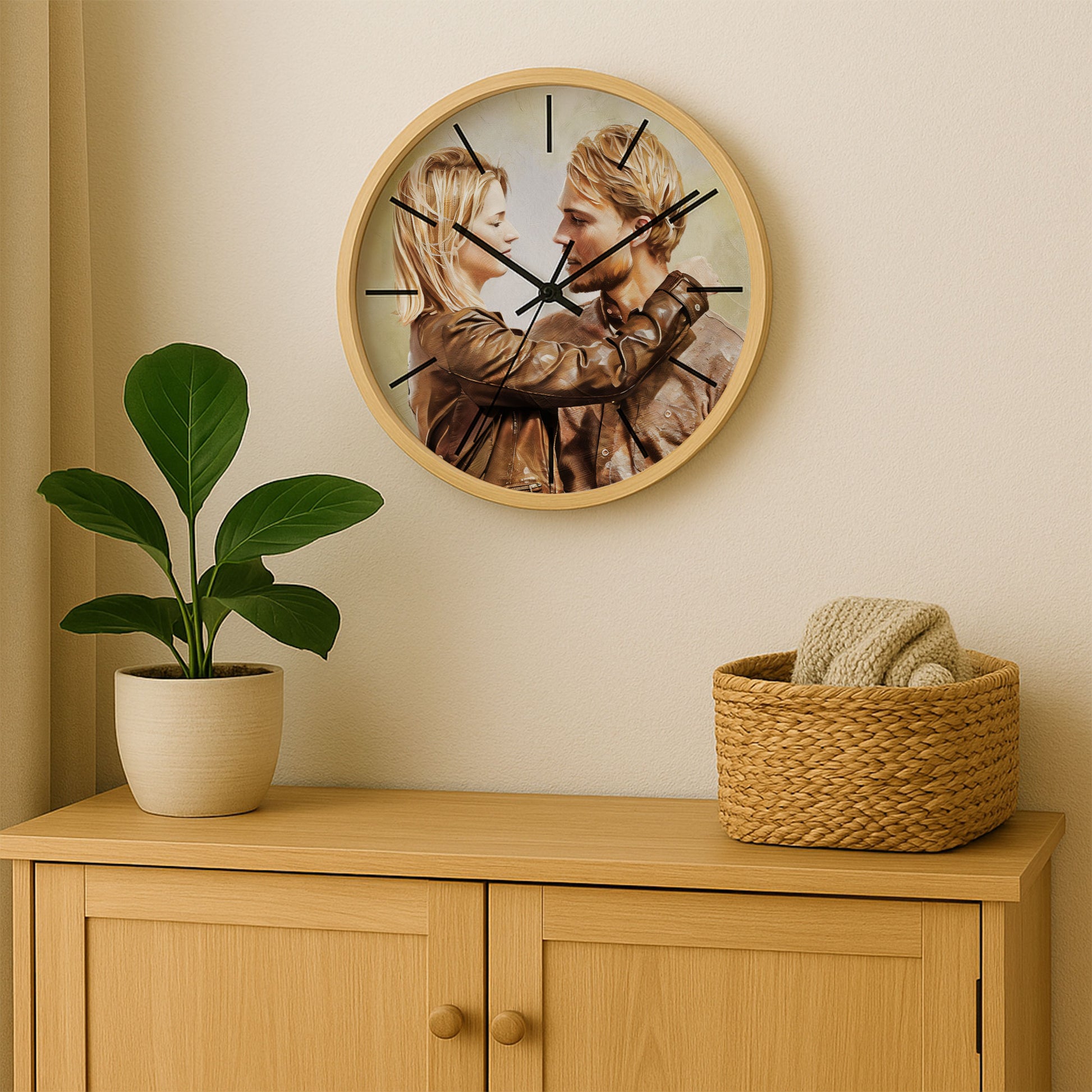 "Each time I check the hour, the oil painting immortalizes our most romantic couple moment—a gift that layers deep, textured strokes to echo the richness of our bond. The classic artistry and warm tones transform that sweet memory into a timeless scene, while the clock’s movement marks the continuous growth of our story. It’s a heartfelt fusion of function and sentiment, a daily homage to the love that only grows more profound with every passing moment."
