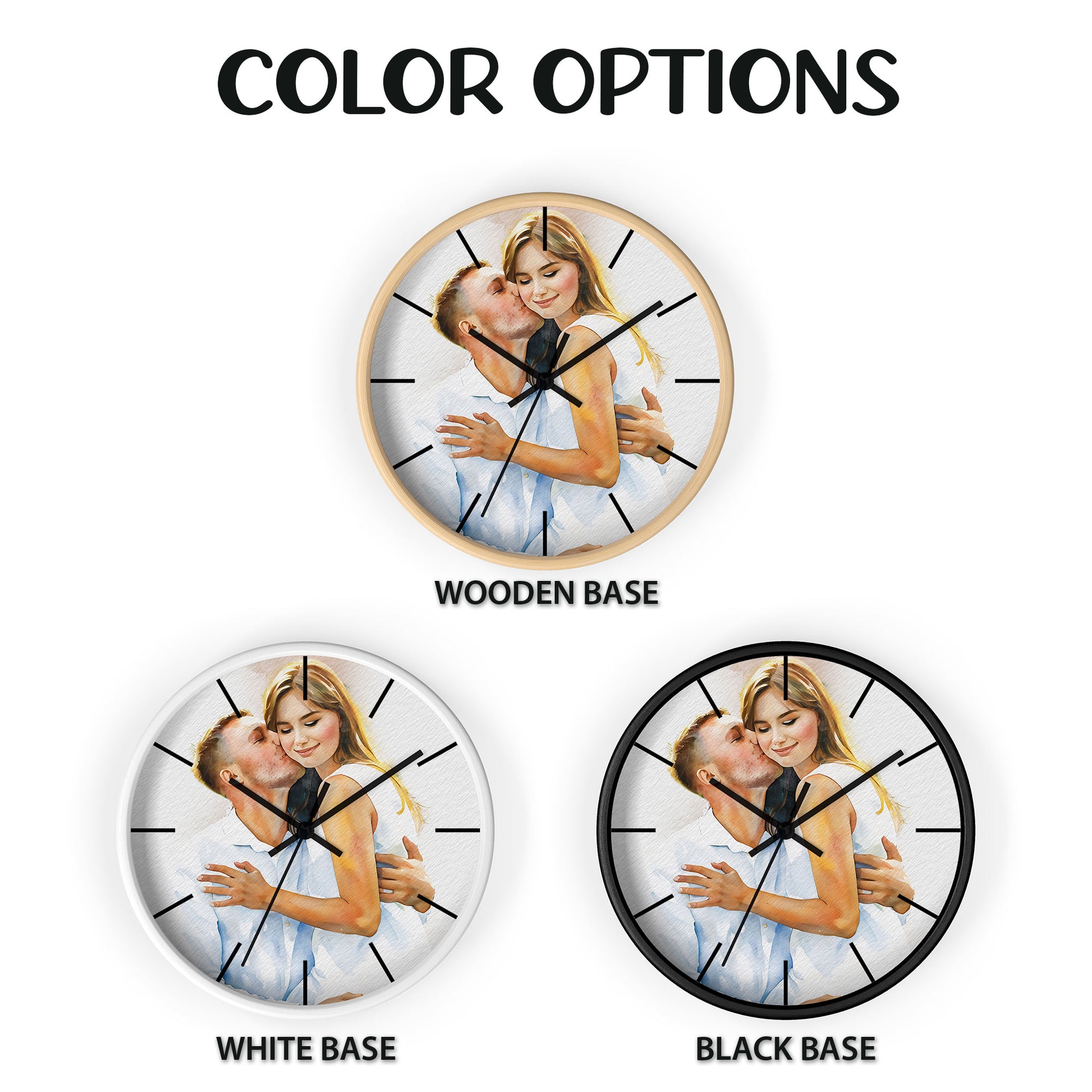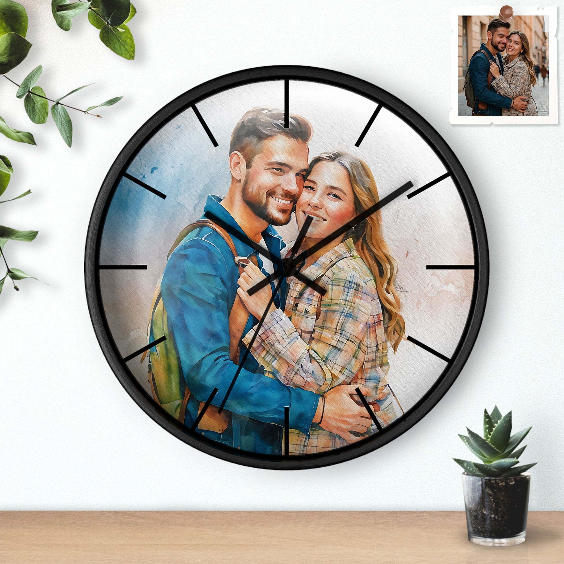 Custom Photo to Art Couple Portrait Wall Clock Watercolor Style Romantic Anniversary Gift