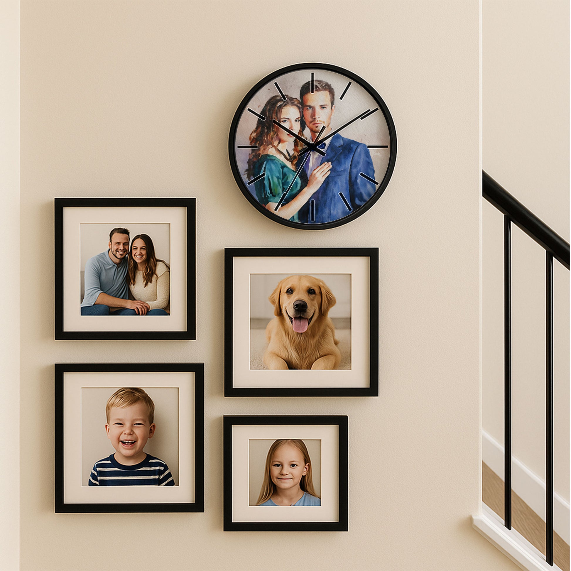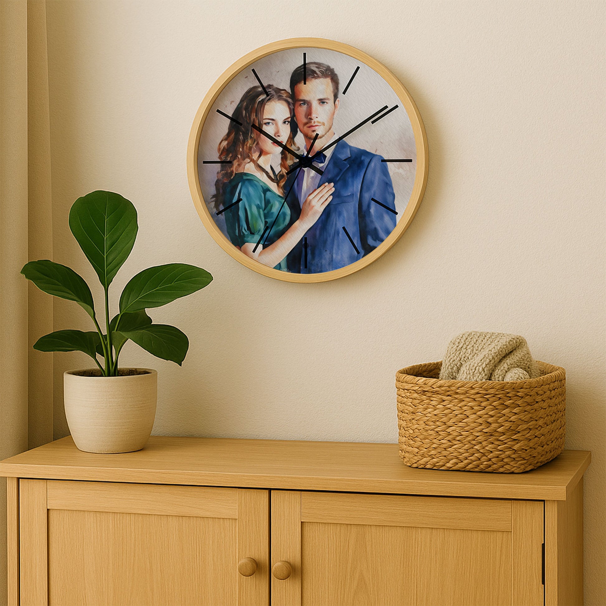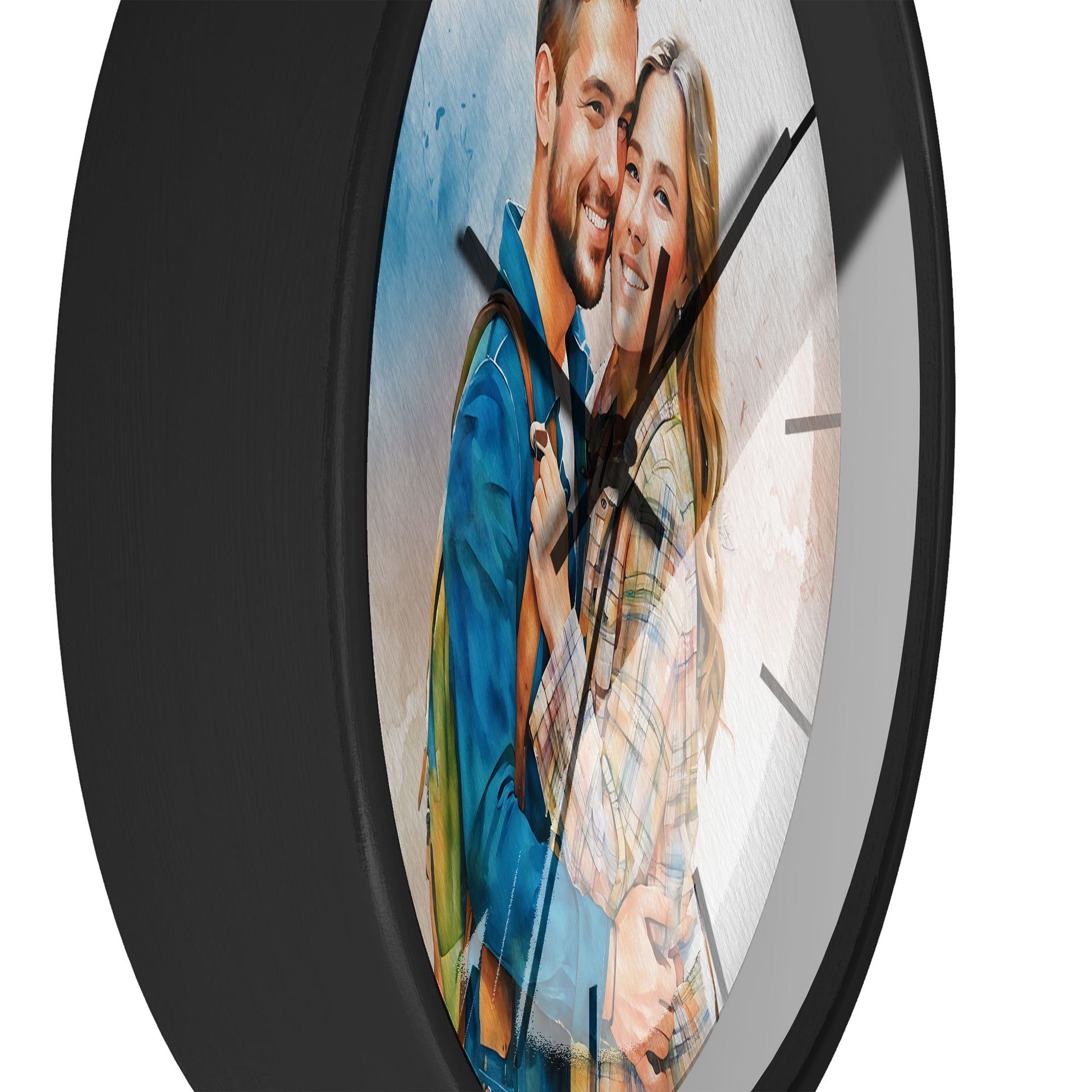 "Watching the hands sweep across the watercolor, our couple portrait feels like a heartbeat—a romantic anniversary gift that paints time with the vibrant hues of our love. The soft, flowing colors blend our features into a dreamy union, while each tick marks another moment cherished together. It’s more than a clock; it’s a daily celebration of our journey, a constant reminder that every second is beautifully ours."
