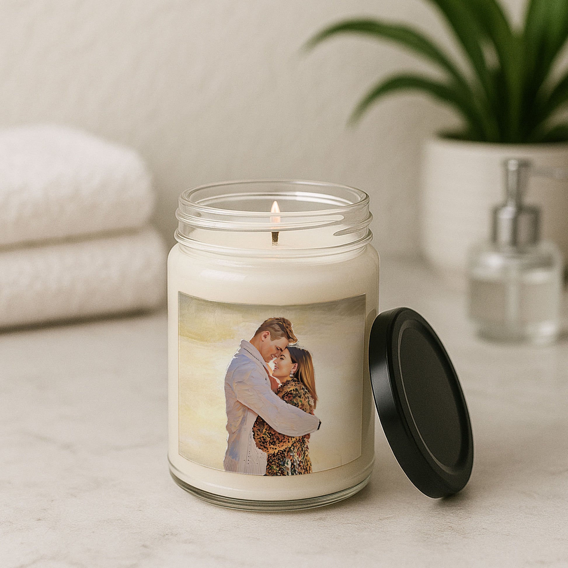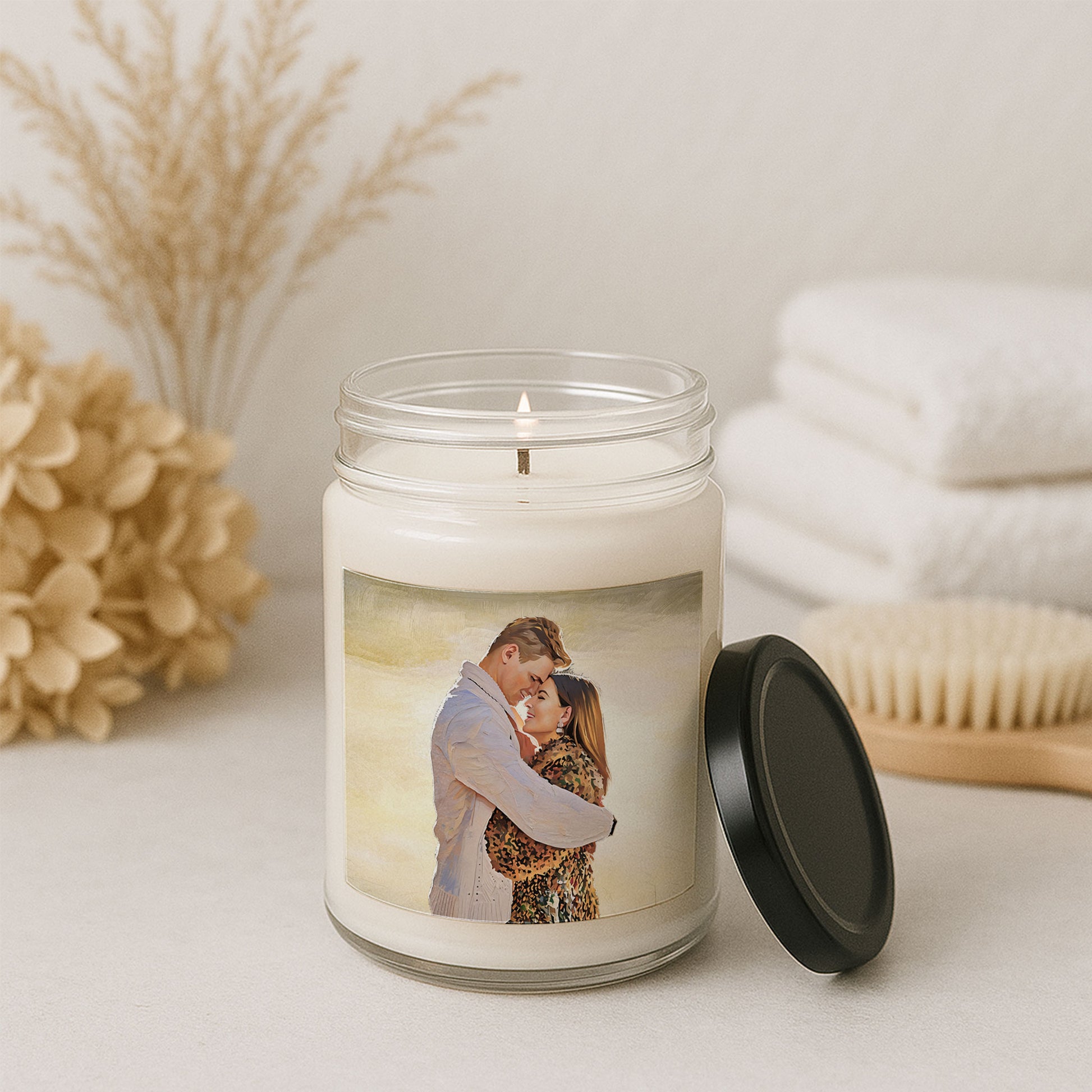 Elevate your space with the warm glow and immersive aromas of our premium soy candles. Hand-poured into a sleek 9oz glass jar, each candle is crafted with care using a 100% natural soy wax blend, cotton wick, and finished with a glossy permanent label featuring your custom design.
