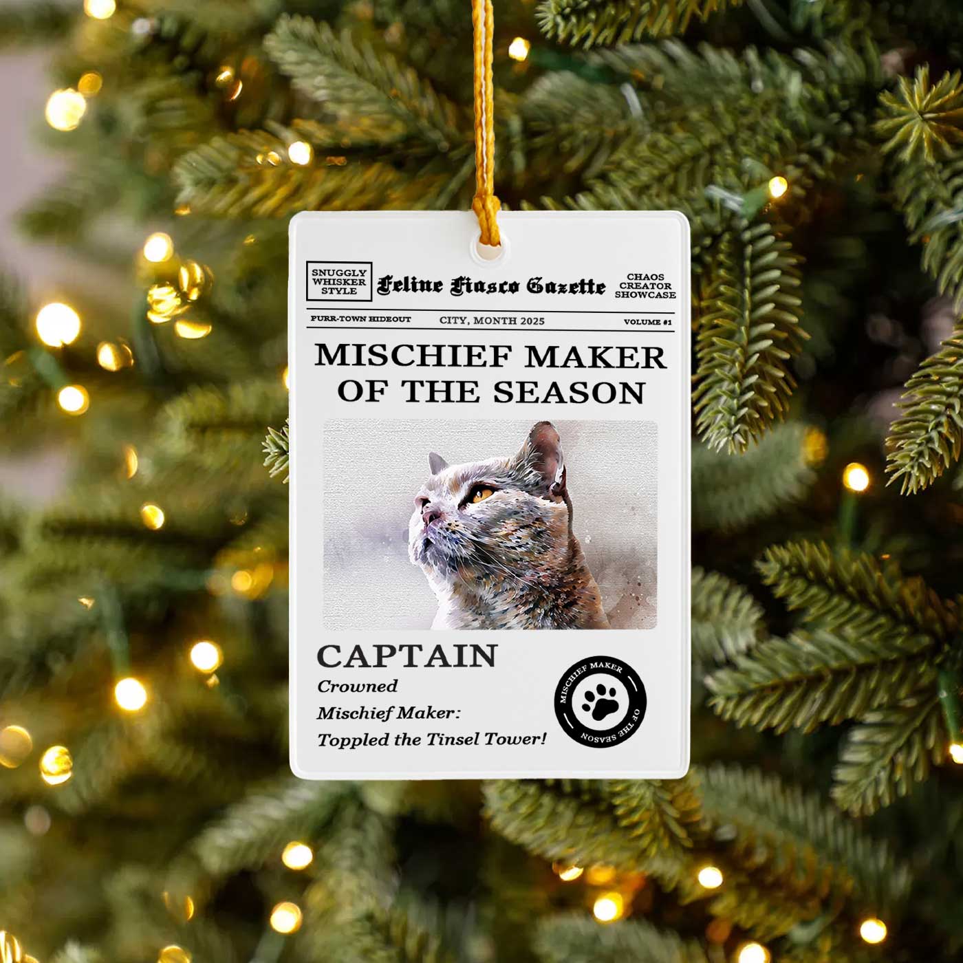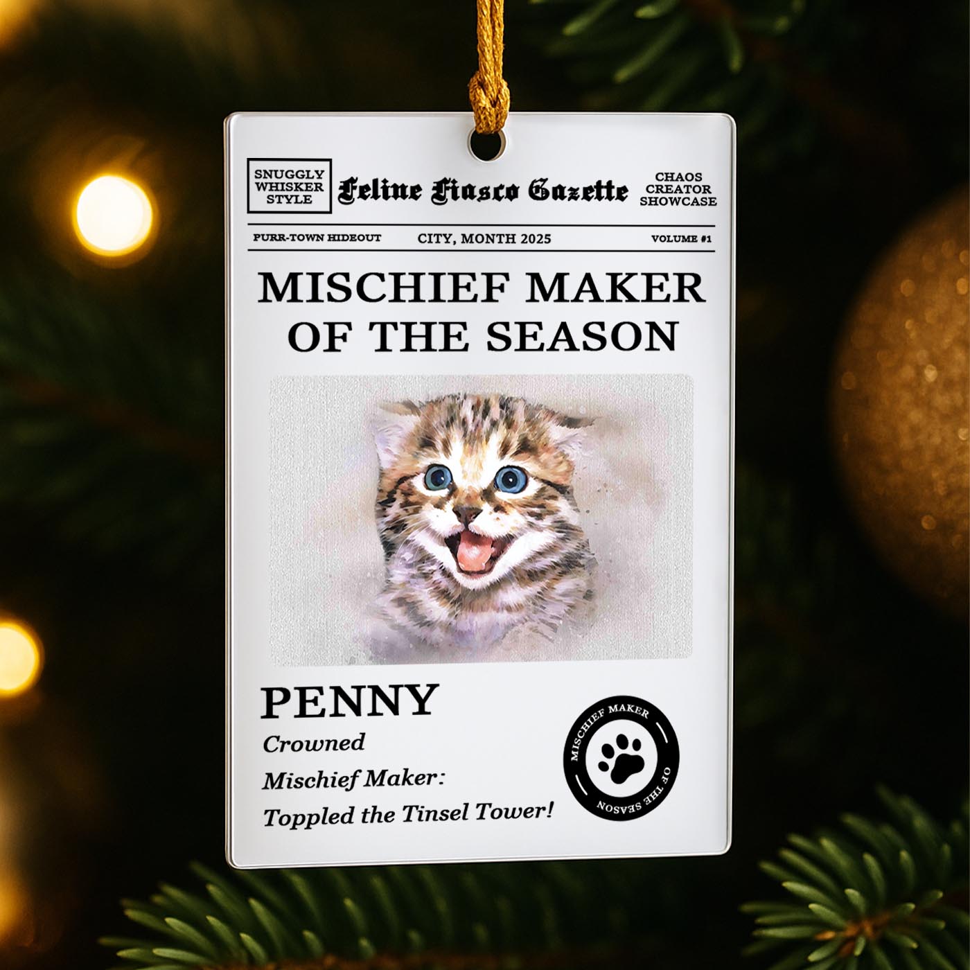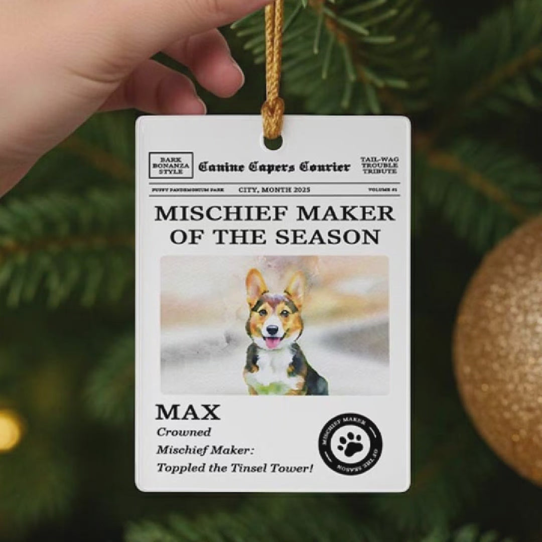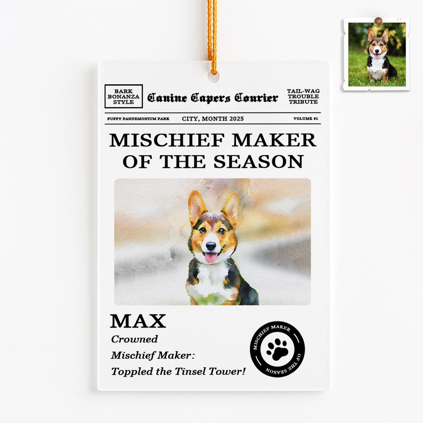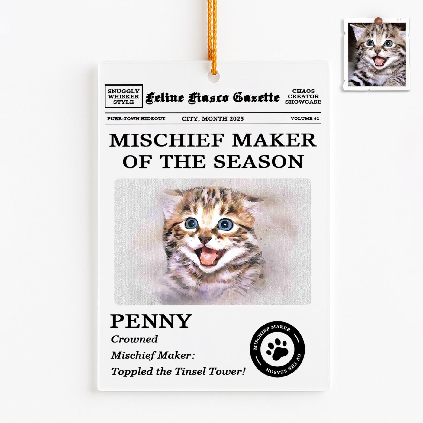 Capture the fun of your furry friend's holiday antics! This unique custom acrylic ornament transforms your beloved dog or cat's face into a sparkling, newspaper-inspired portrait—celebrating them as the true "Mischief Maker of the Season."