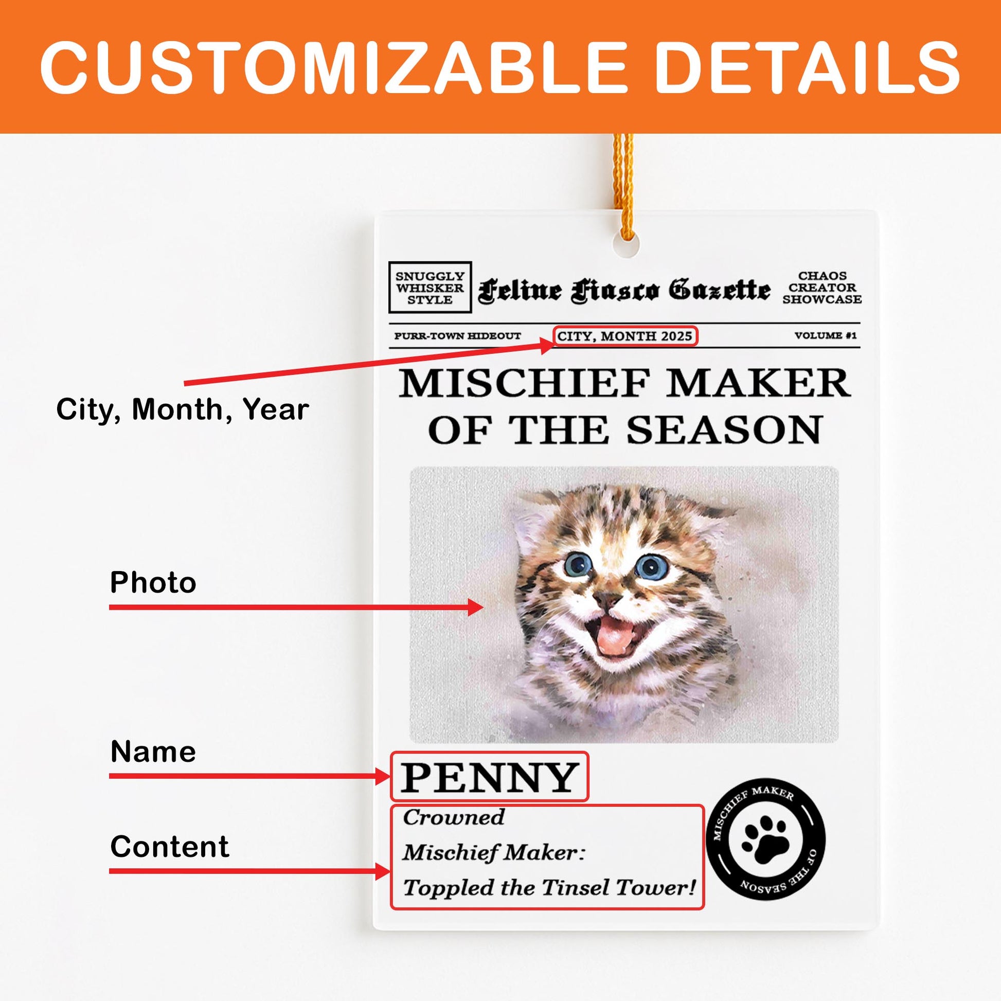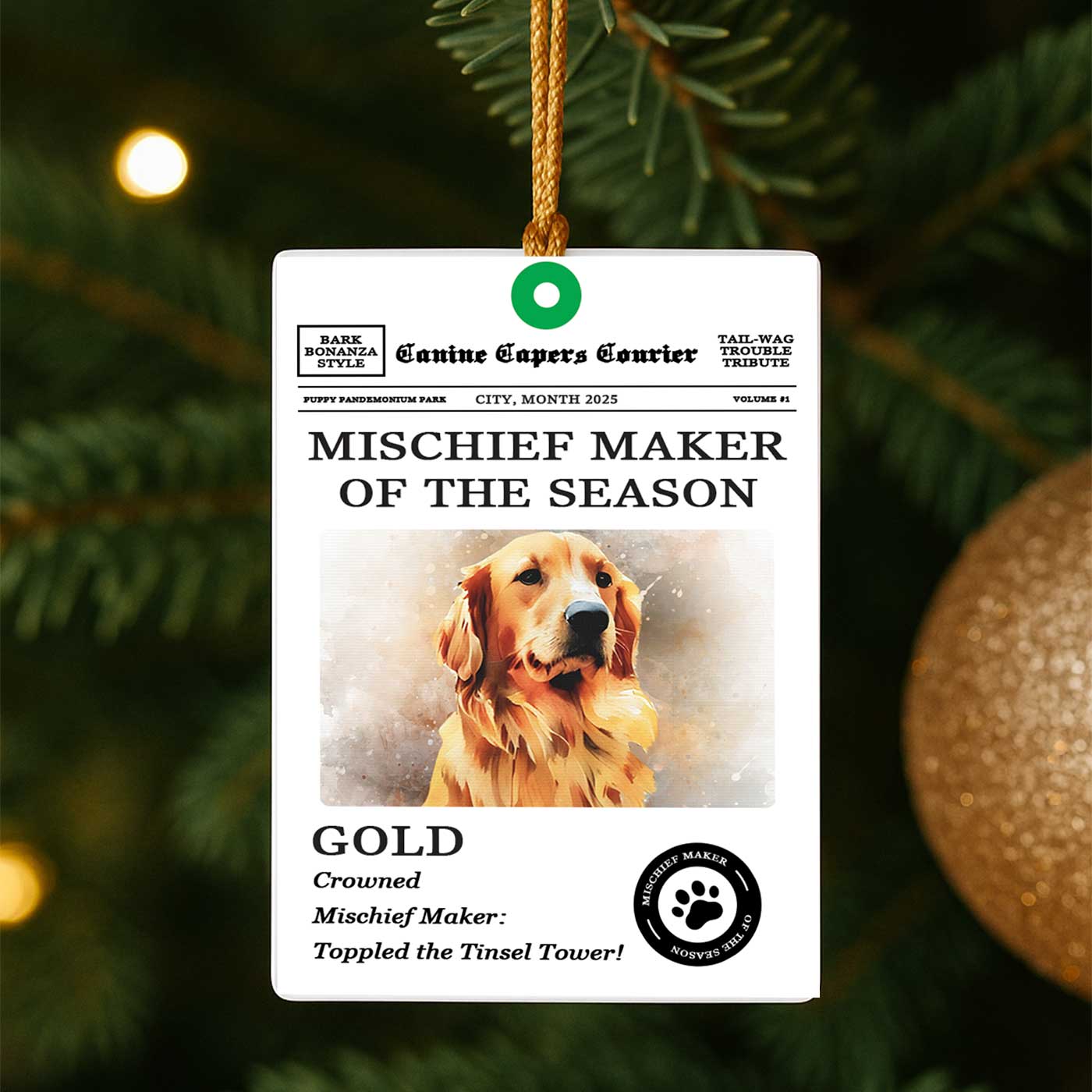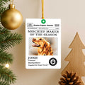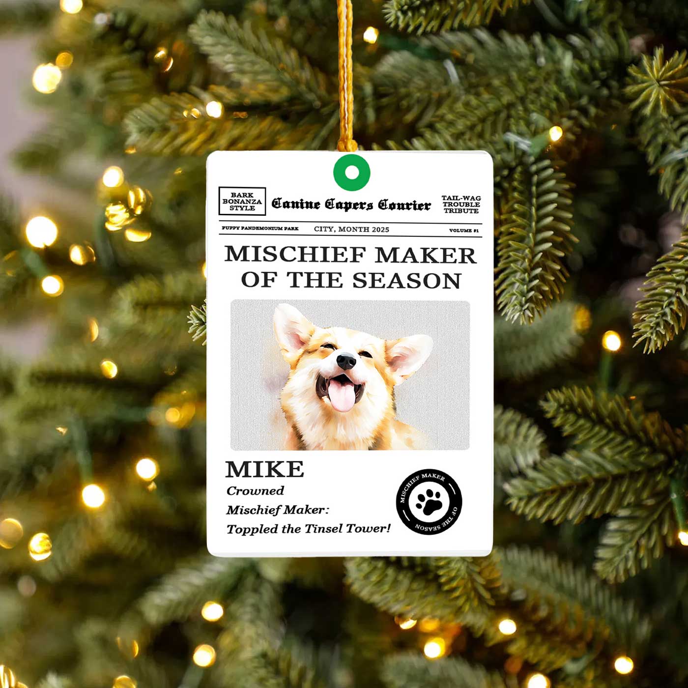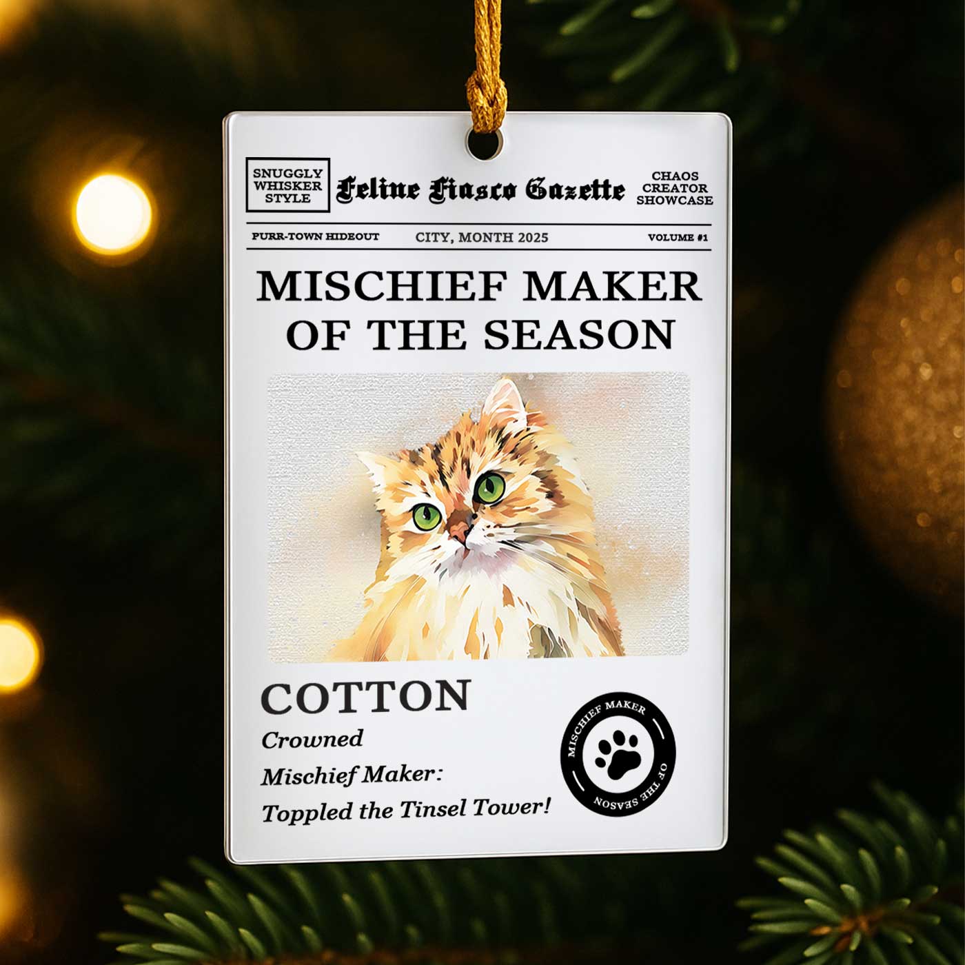 Capture the fun of your furry friend's holiday antics! This unique custom acrylic ornament transforms your beloved dog or cat's face into a sparkling, newspaper-inspired portrait—celebrating them as the true "Mischief Maker of the Season."