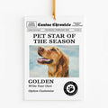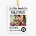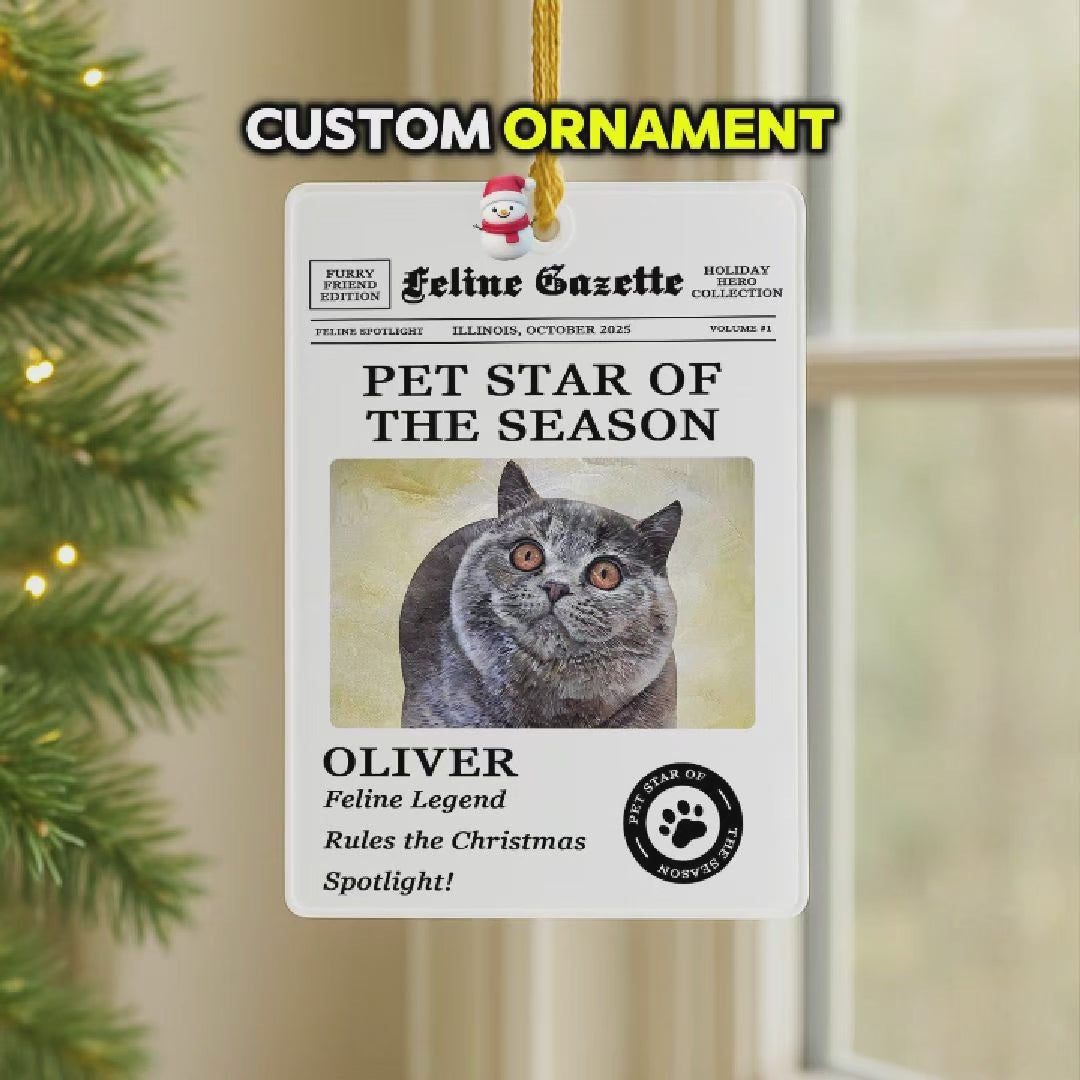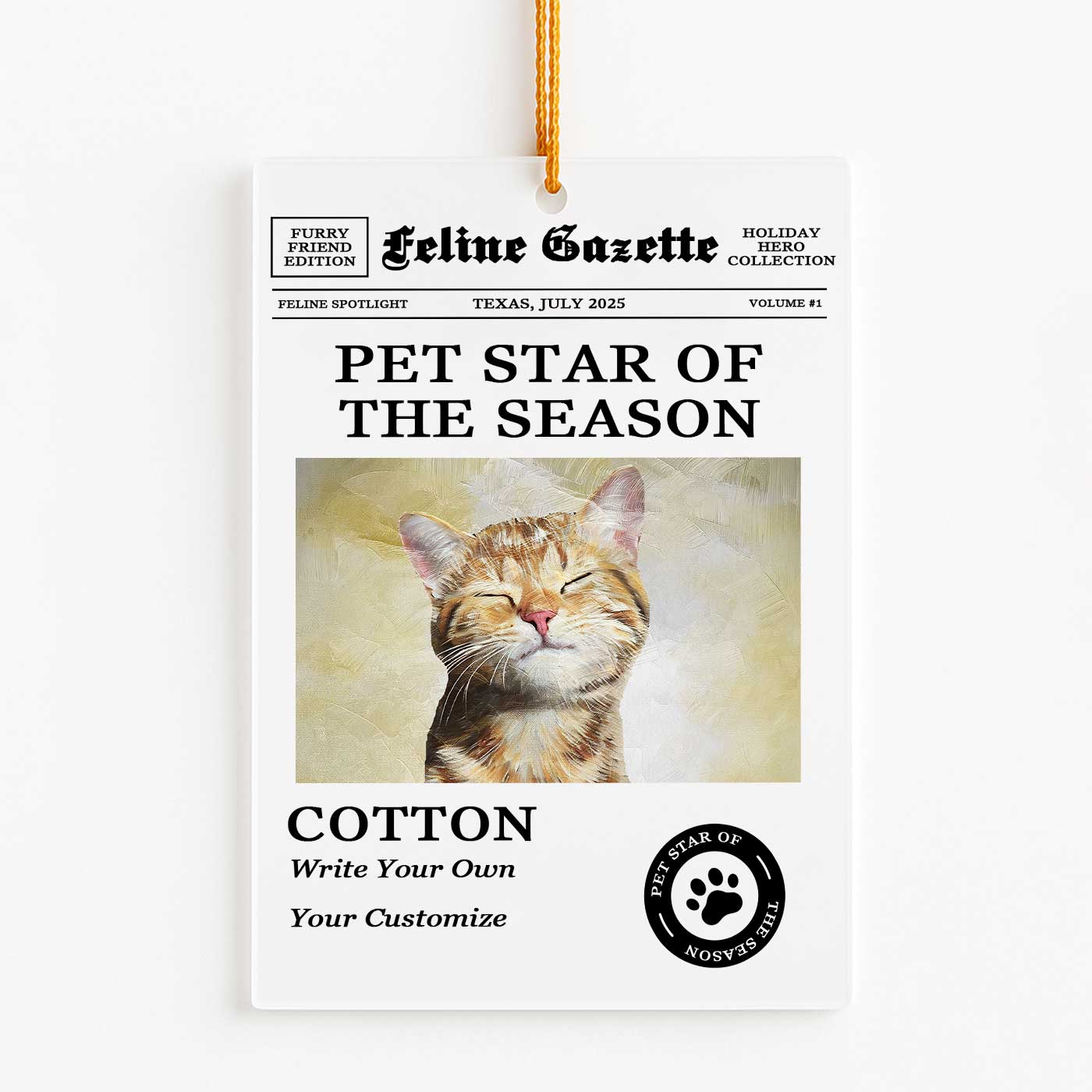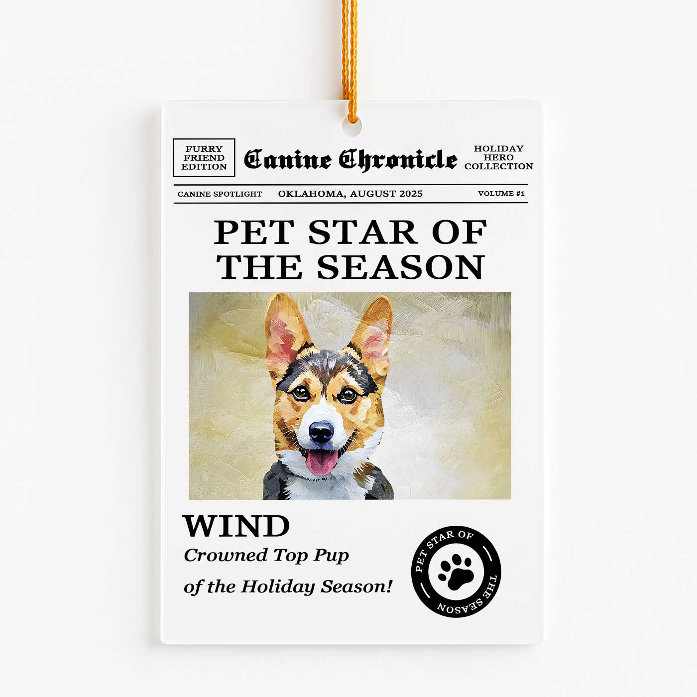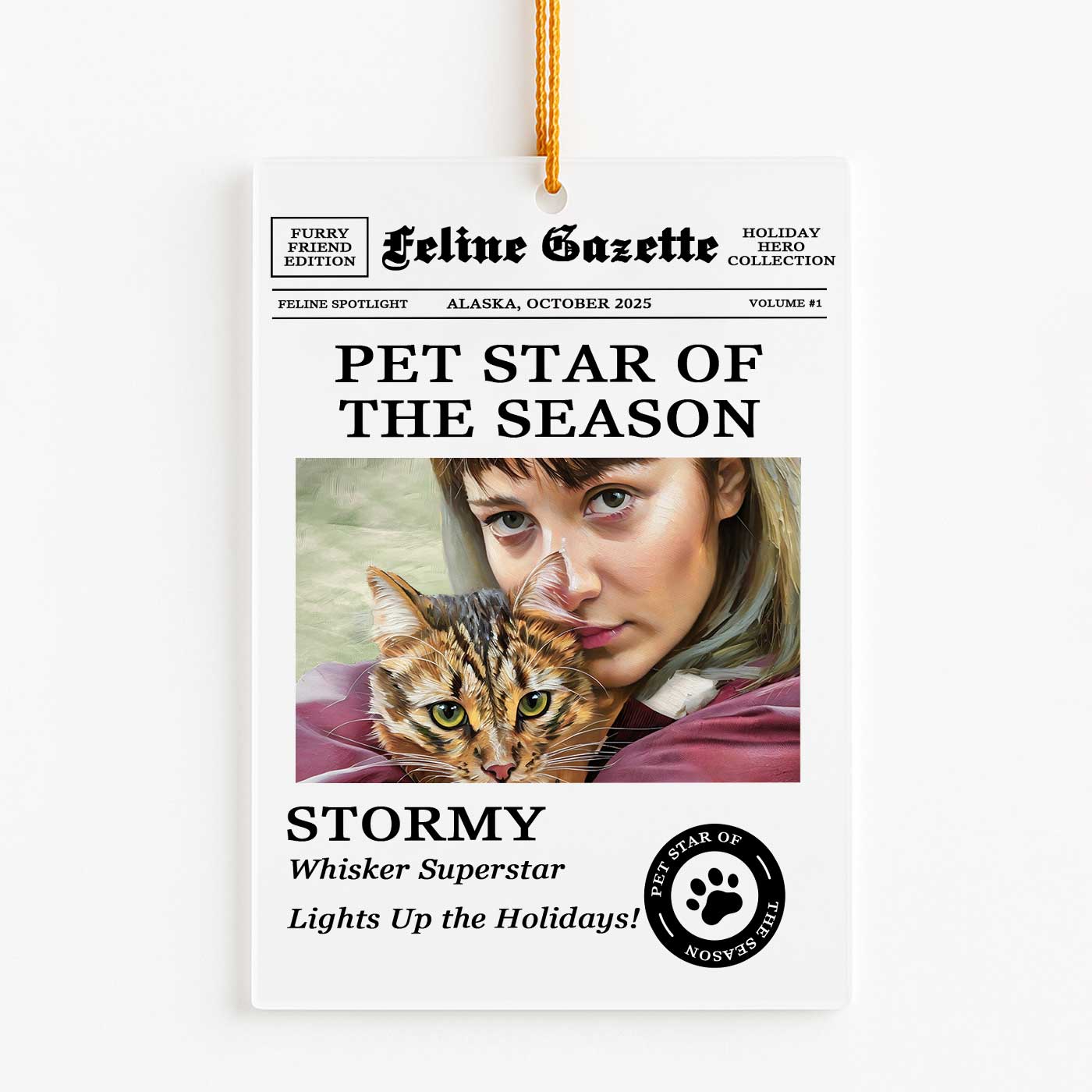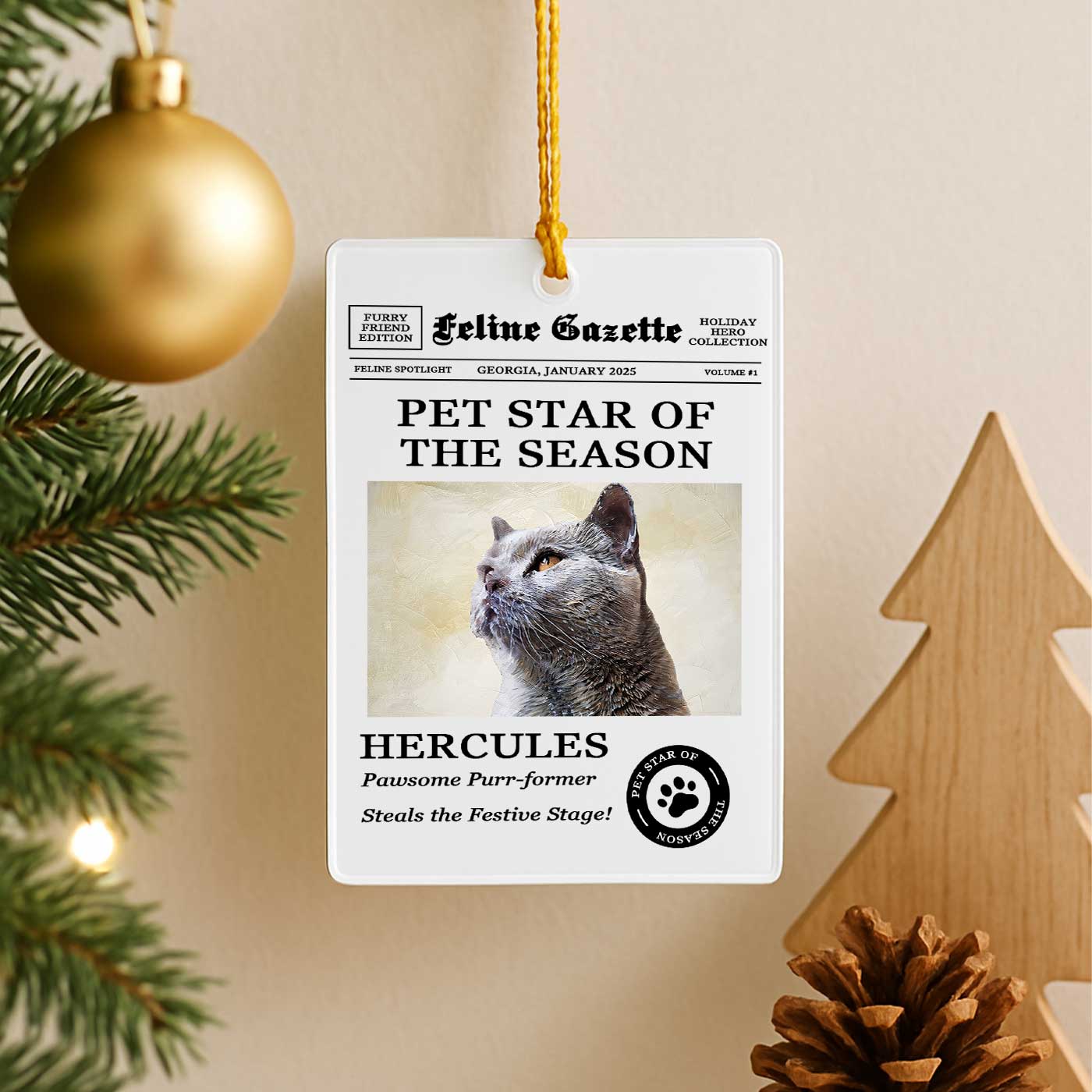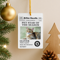 This isn’t just an ornament; it’s a story of your furry friend’s adventures, crafted just for you. With our easy customization, you upload your pet’s photo, enter your pet's name, and choose a newspaper headline or write your own custom message. Whether your pup’s a loyal sidekick or your kitty’s a mischievous maestro, this ornament transforms their personality into a holiday masterpiece.