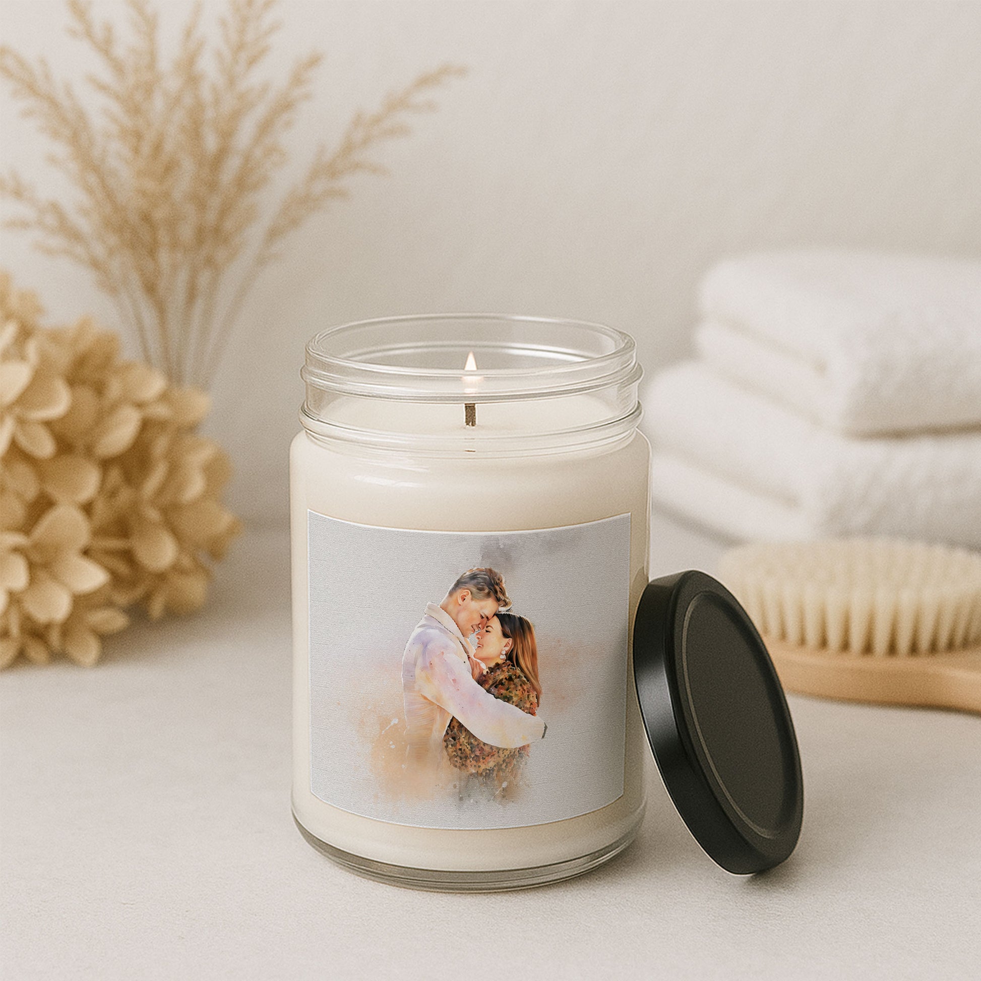 "Watching the flame dance over the watercolor, our love picture seemed to breathe with life—a couple gift that turned a simple photo into a flowing, emotional masterpiece. The soft blends and gentle gradients mirrored the depth and tenderness we share, while the warm scent wrapped us in a shared sense of comfort. It’s a heartfelt expression of us, a piece that fills the room with both light and the profound, beautiful essence of our connection."