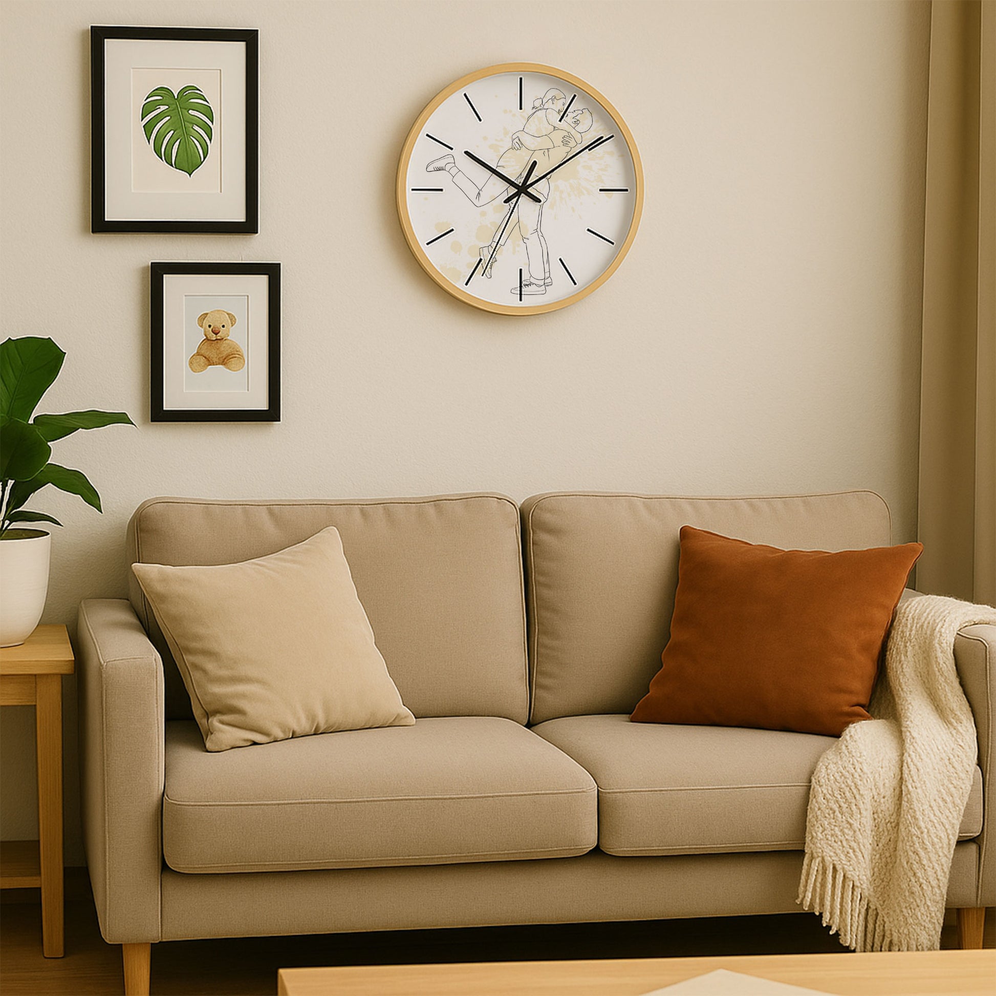 "I wanted to capture us not in a photograph, but in something more timeless—a moment suspended in elegant simplicity. The line art transformed our laughter, our closeness, into a delicate web of connections, each stroke representing a shared memory, a silent understanding. Against the open space, our intertwined silhouettes feel both intimate and eternal—a quiet language of belonging. Now, as the hands of the clock circle this gentle portrait, I’m reminded that family isn’t defined by grand gestures, but by these subtle, enduring lines of love, drawn not in ink, but in time."