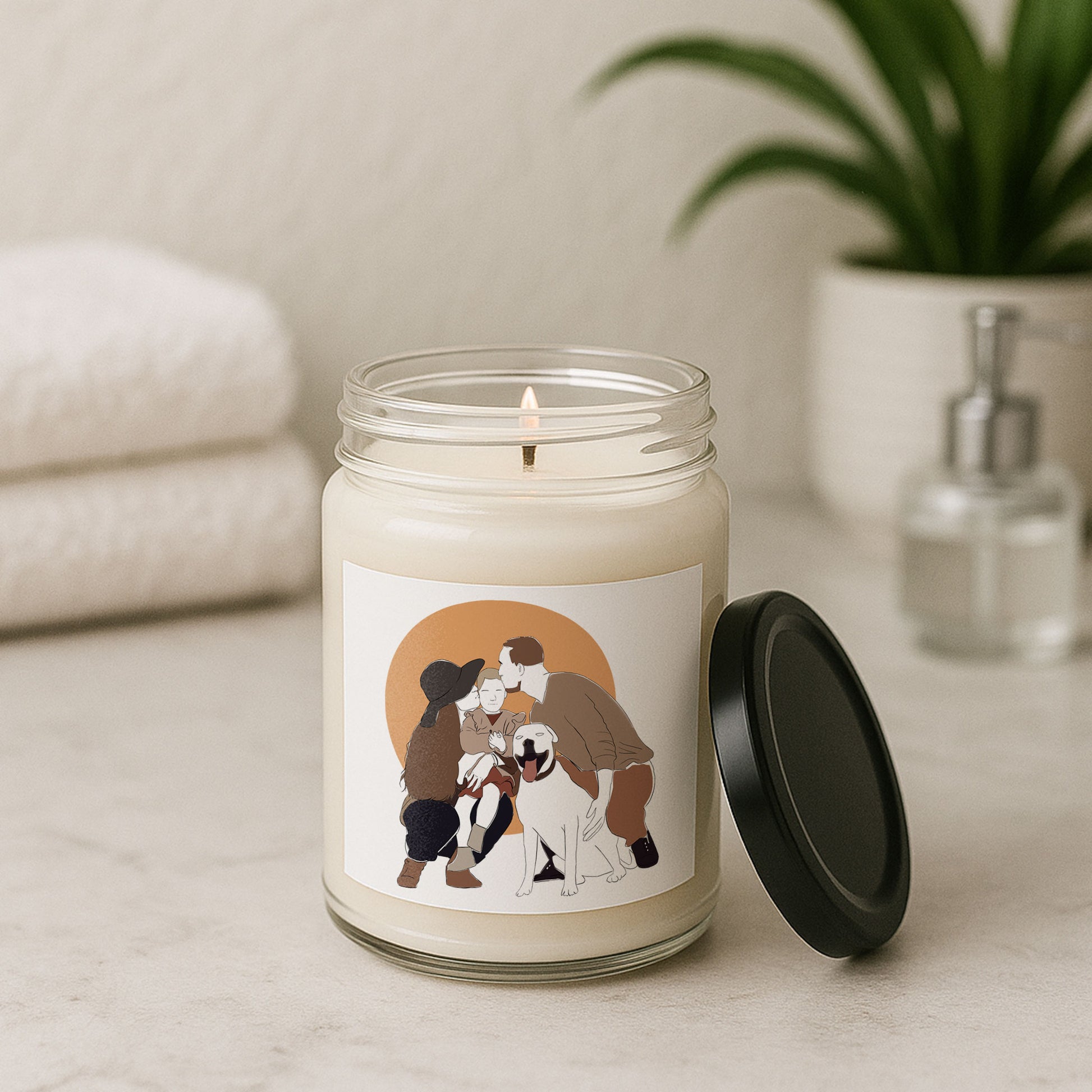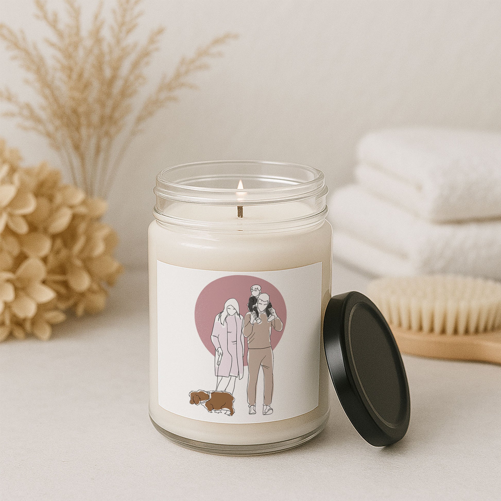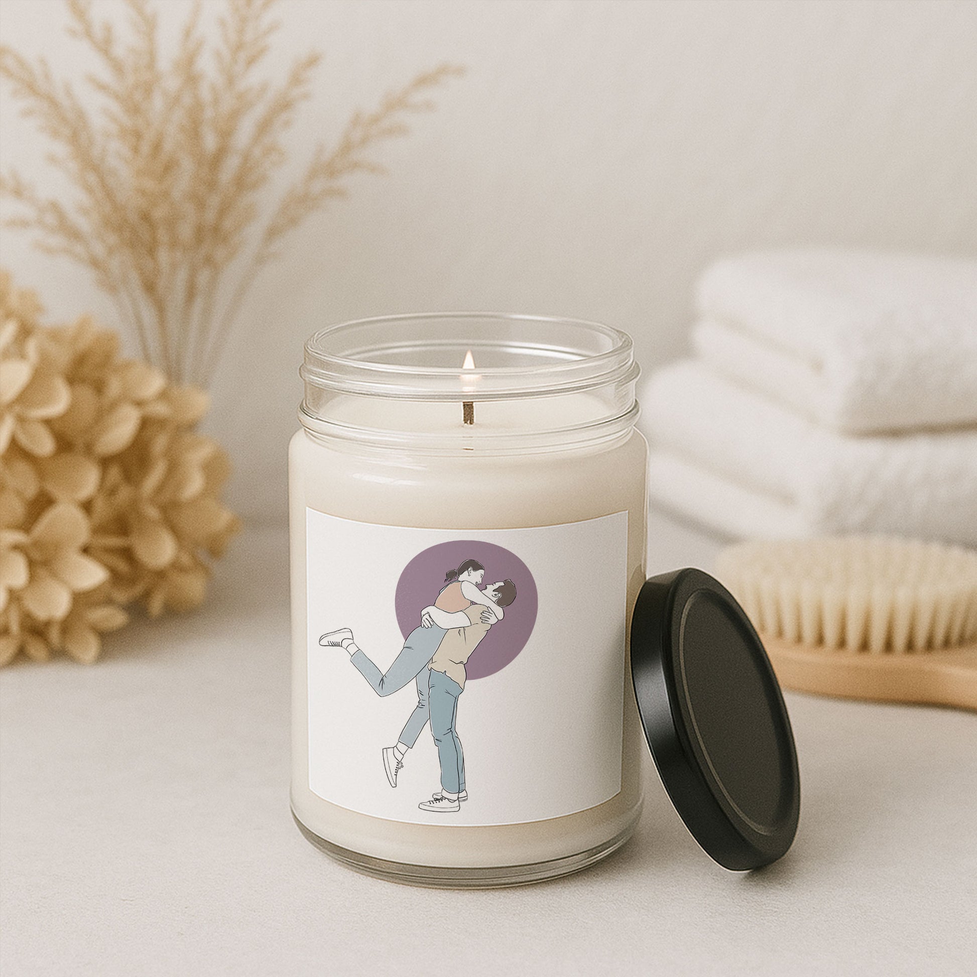 Elevate your space with the warm glow and immersive aromas of our premium soy candles. Hand-poured into a sleek 9oz glass jar, each candle is crafted with care using a 100% natural soy wax blend, cotton wick, and finished with a glossy permanent label featuring your custom design.