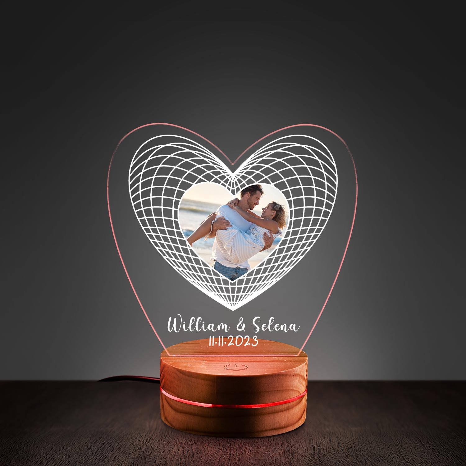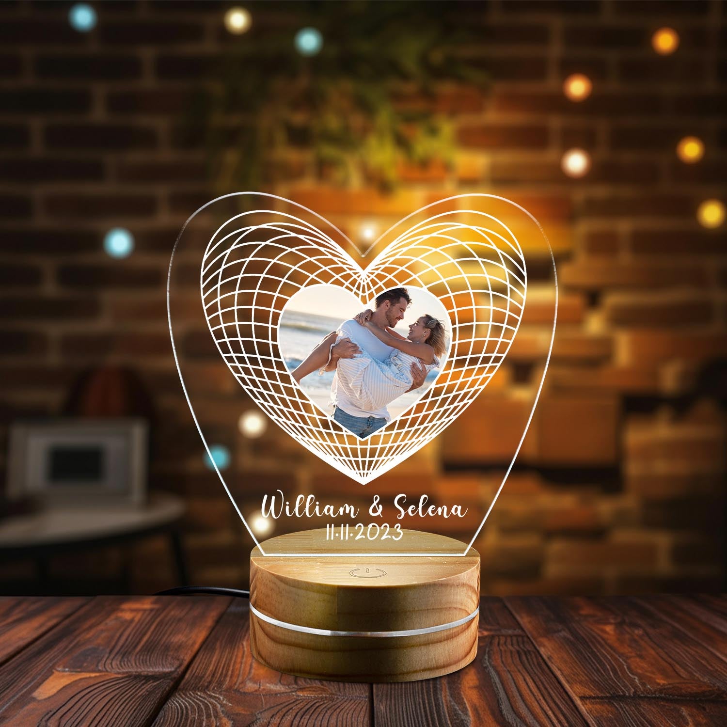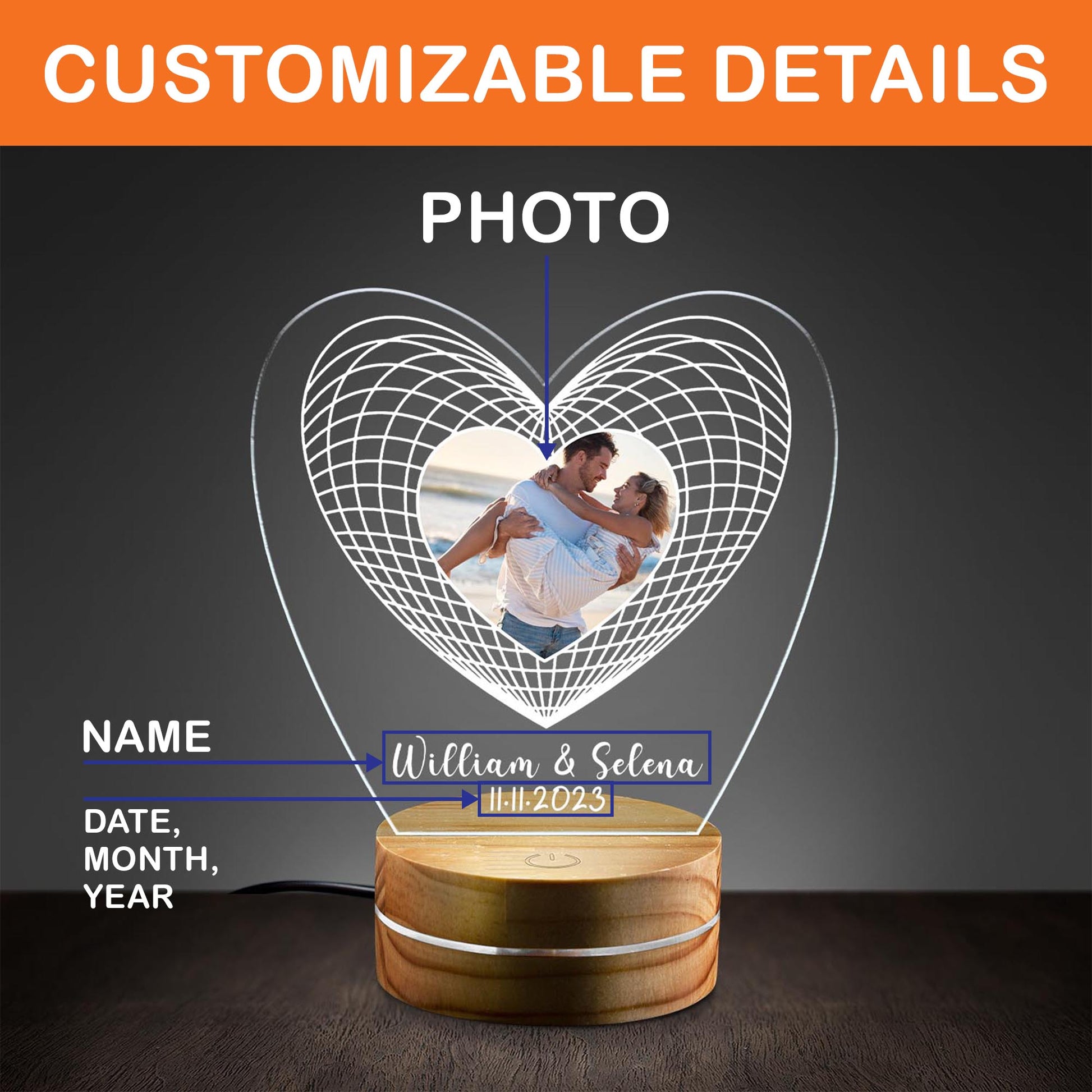 Illuminate the Heart of Your Love Story In a world of generic gifts, something made specifically for your relationship carries a glow that never fades. Our Custom Heart Photo Night Light is crafted for couples who want to immortalize their most cherished moments—from the day they met to their beautiful wedding ceremony. Featuring a stunning heart-shaped acrylic plaque and a premium Round Wooden Base, this lamp elegantly showcases your favorite photo alongside your names and that one special date that changed your lives forever. It serves as a high-end, sentimental piece of home decor that turns any room into a warm gallery of your journey together. Whether it's for Valentine’s Day, a Wedding, or a milestone Anniversary, this is the ultimate "one-of-a-kind" gift that says "I love you" in every color.