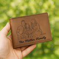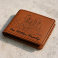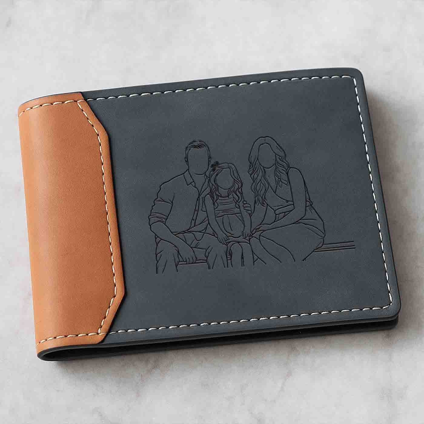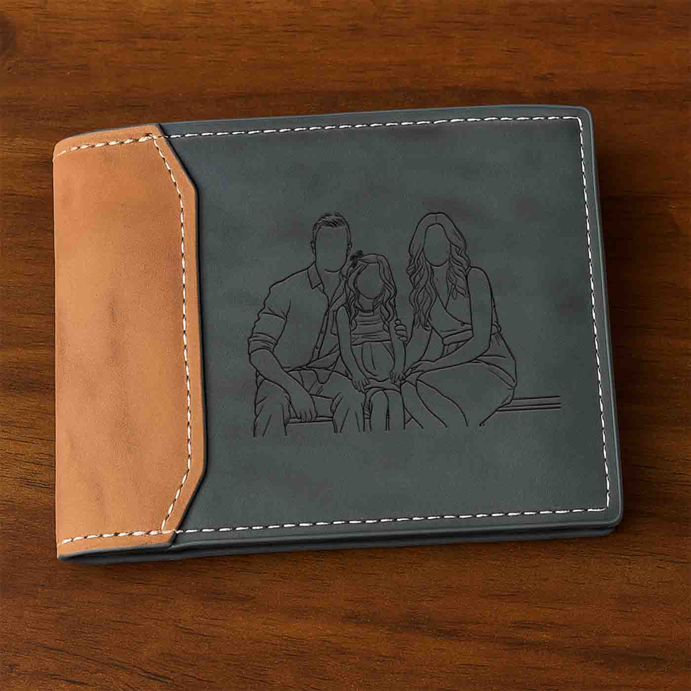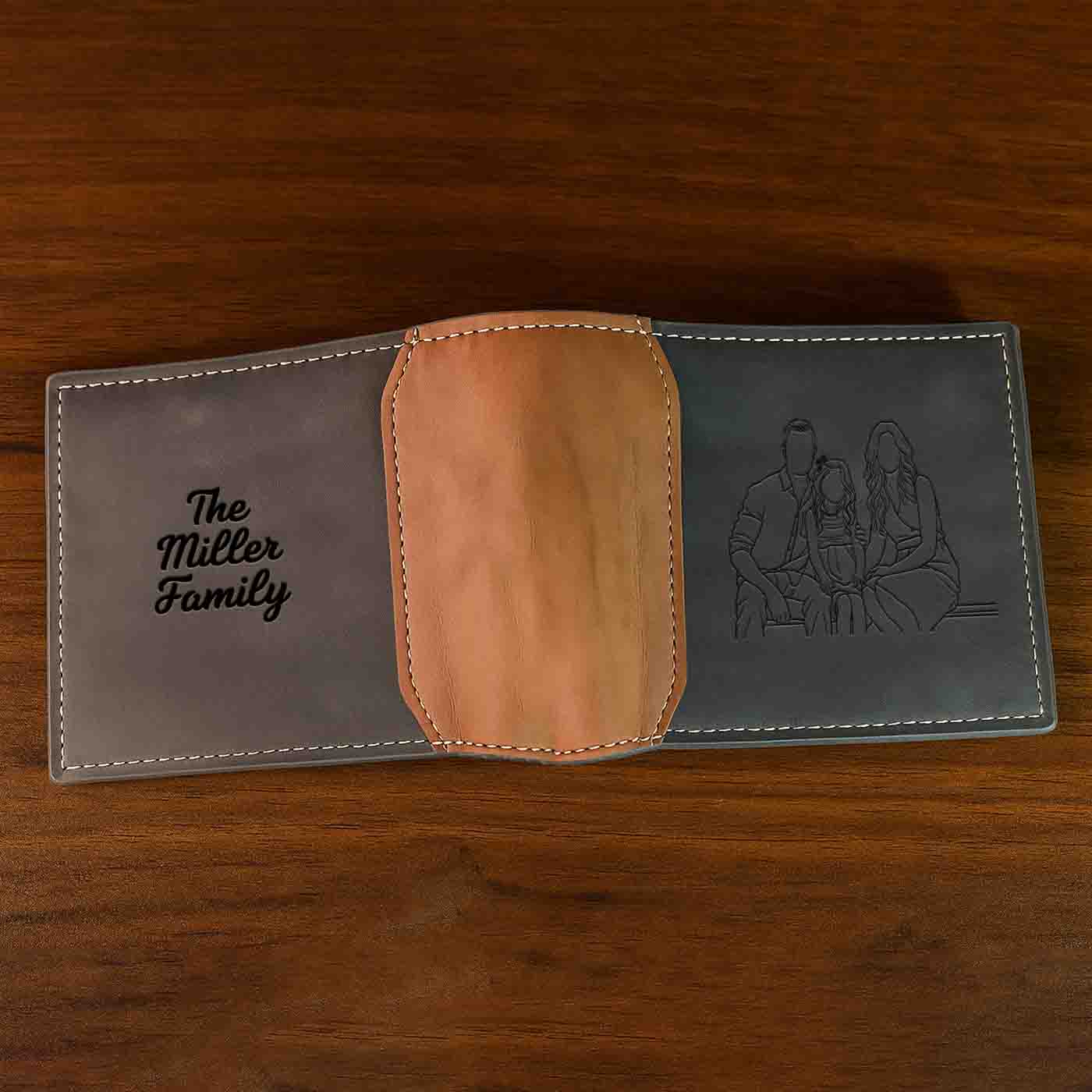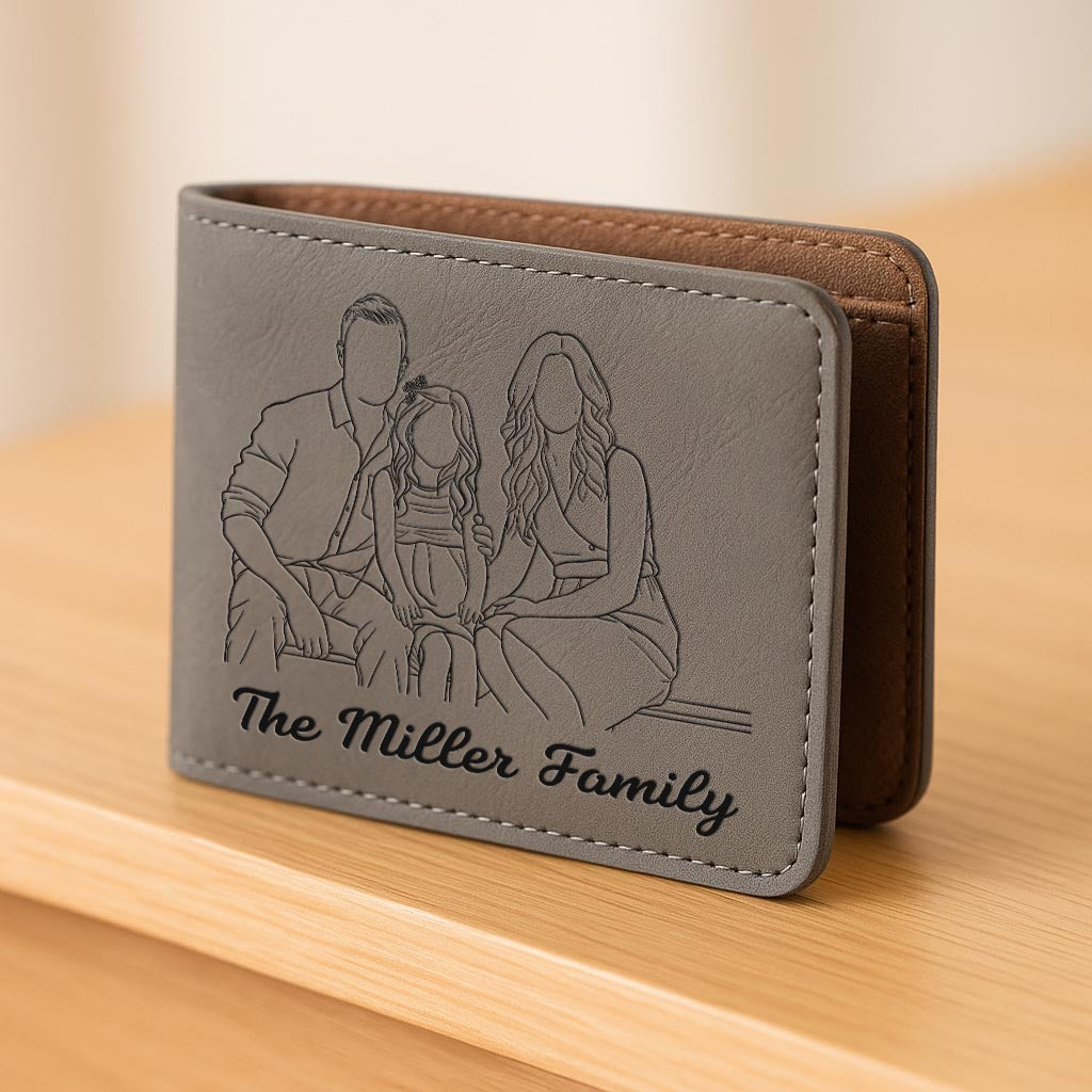 The ultimate Personalized Photo to Pencil Sketch Family Portrait Leatherette Bifold Wallet. Transform your favorite photo into a timeless line art design, elegantly laser-etched onto a smooth, durable leatherette finish. More than an accessory, it's a unique keepsake and the perfect gift for Father's Day, Mother's Day, or any anniversary. Carry your loved ones and cherished memories wherever you go.