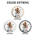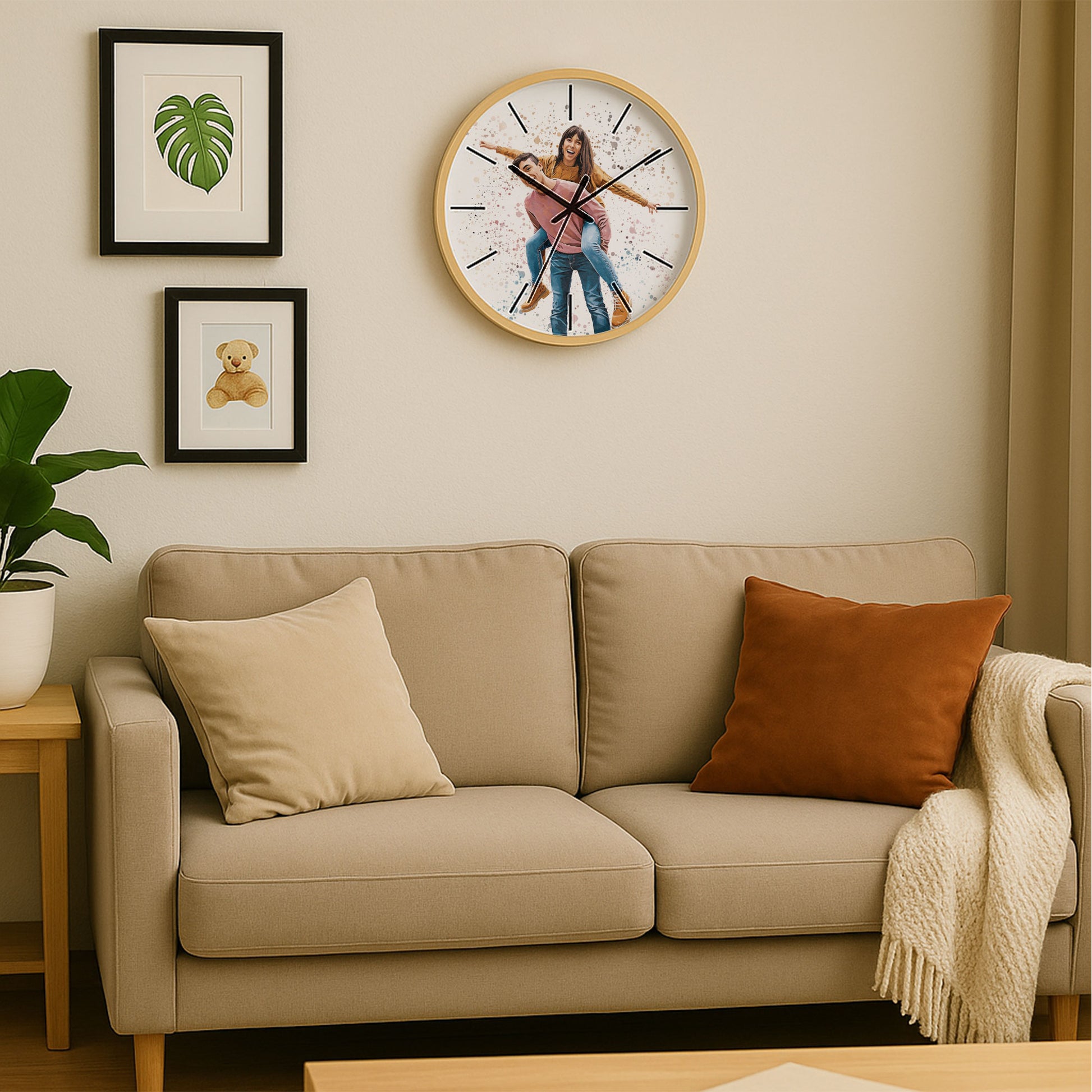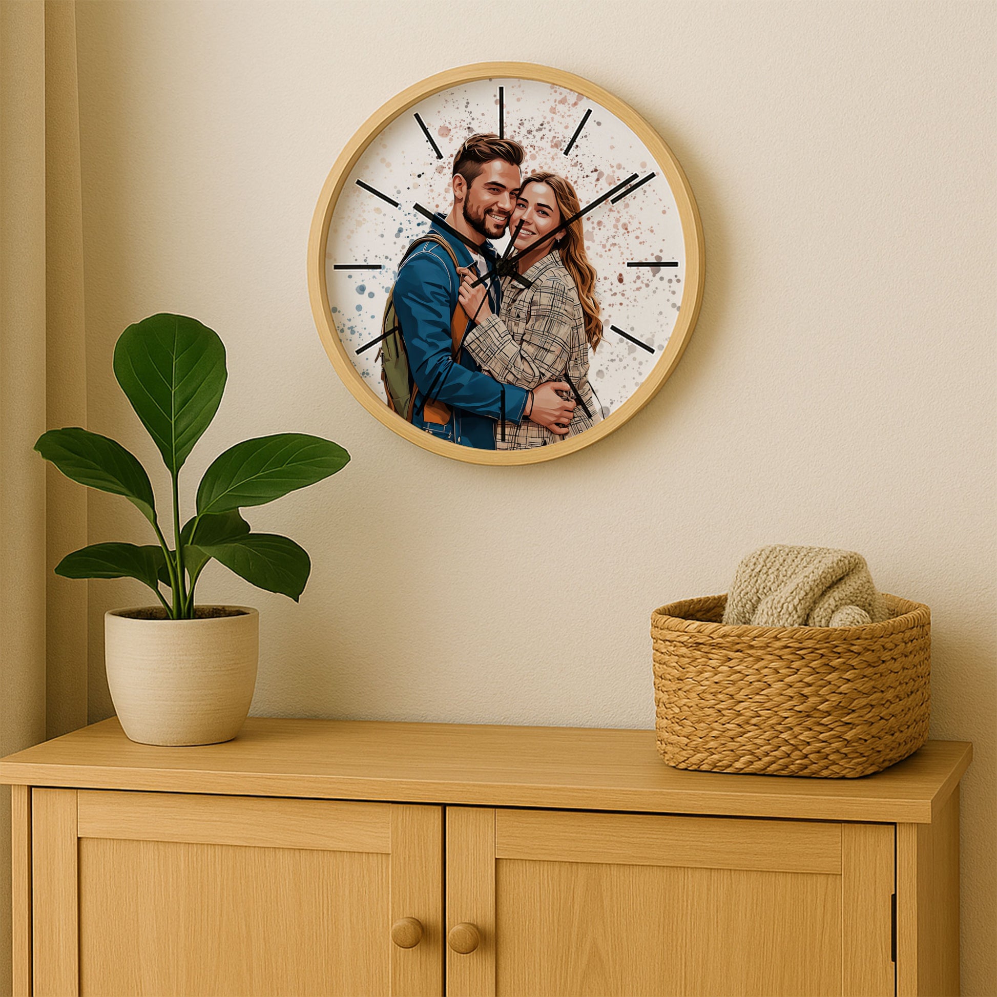 "With every tick, the illustration of our romantic couple moment comes alive—a gift that freezes our sweetest memory in a burst of joyful art. The vibrant strokes and expressive style radiate the energy and affection we felt that day, while the clock’s rhythm mirrors the steady beat of our hearts. It’s a functional piece of our story, a daily reminder that even as time moves forward, that happiness remains forever present and vivid."