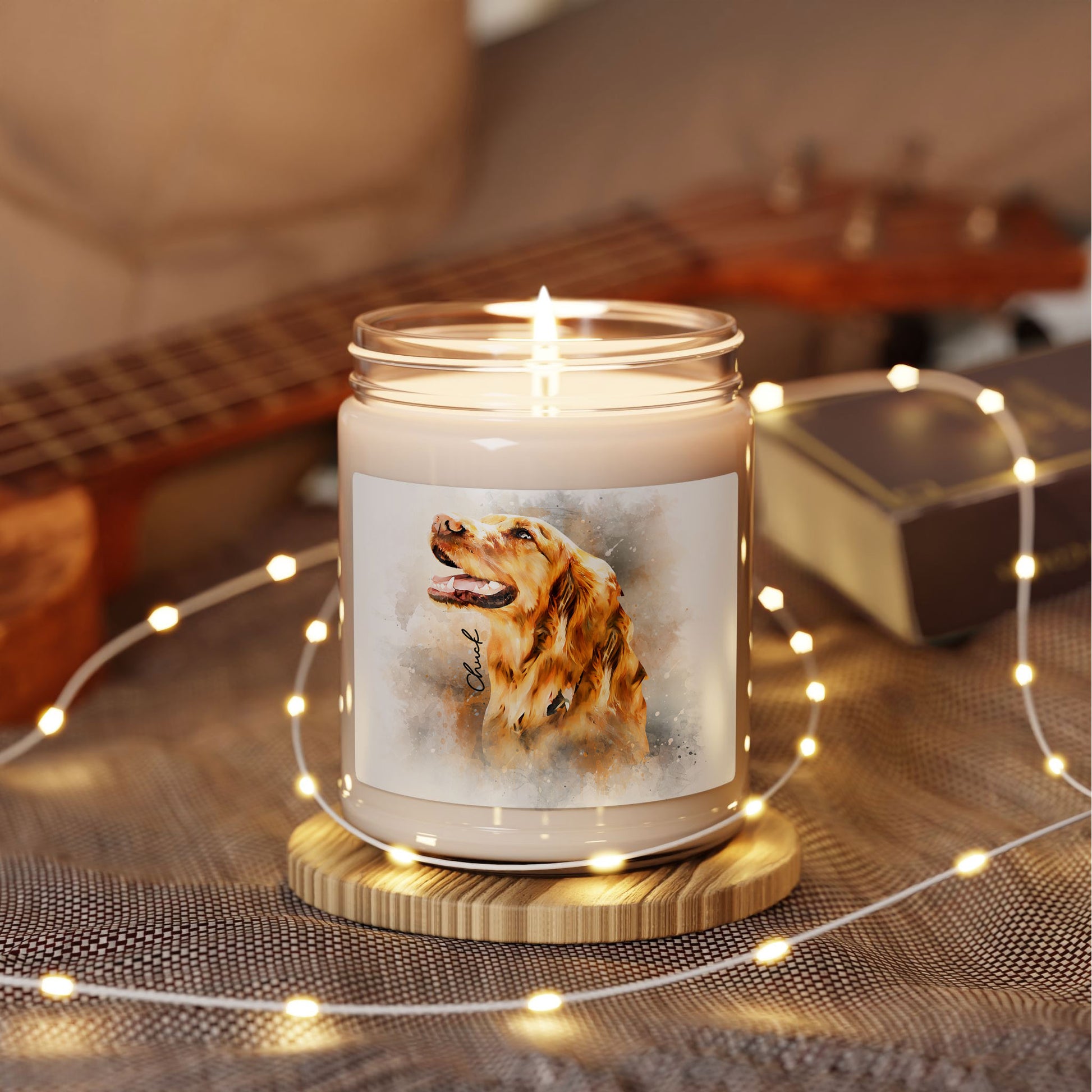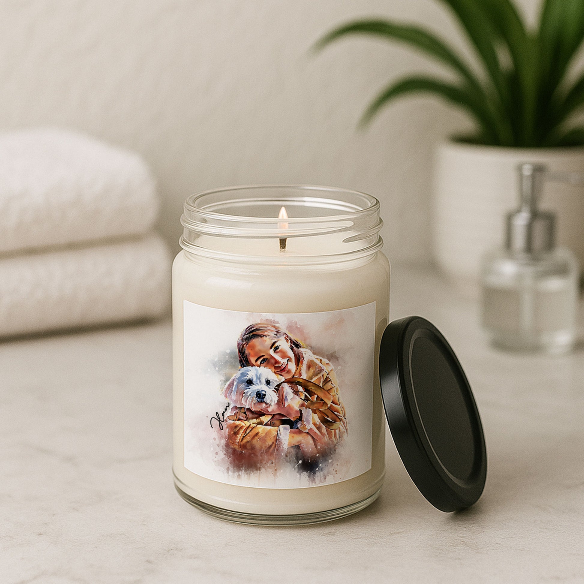 "I still smile thinking about our little adventures—the way my pet would chase leaves in the wind or pause to watch squirrels, each moment bursting with curiosity and joy. I wanted to preserve that playful energy, the vibrant spirit of our explorations, in something that felt alive with color and motion. The watercolor art, with its fluid strokes and bright washes, captured it perfectly—not a still image, but a memory in motion. Now, when the candle glows and its fresh scent fills the air, it brings back those sunlit trails and happy, wagging tails, turning our home into a gallery of shared joy."